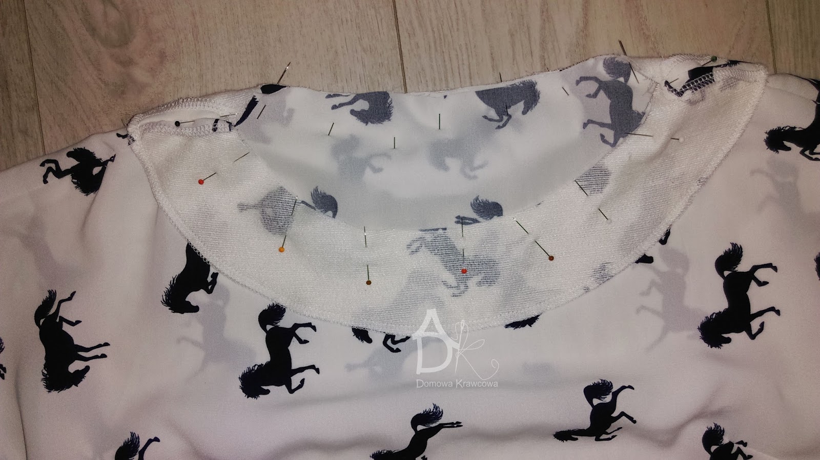 Przypinam szpilkami obłożenie prawą stroną d prawej strony bluzki, zwracam uwagę na równe ułożenia styku na ramionach oraz środki przodu i tyłu bluzki.