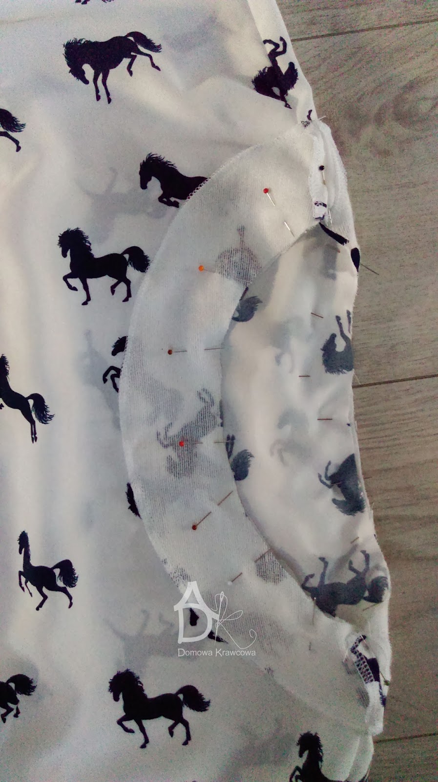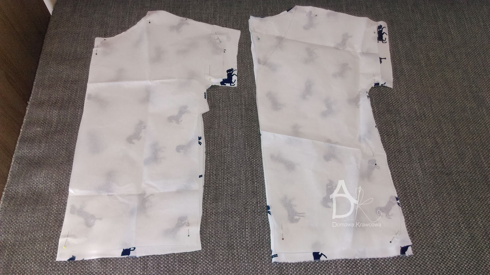 Spinam szpilkami ramiona i zeszywam. Następnie spinam boki bluzki , zostawiam 6cm od dołu na rozporki.
