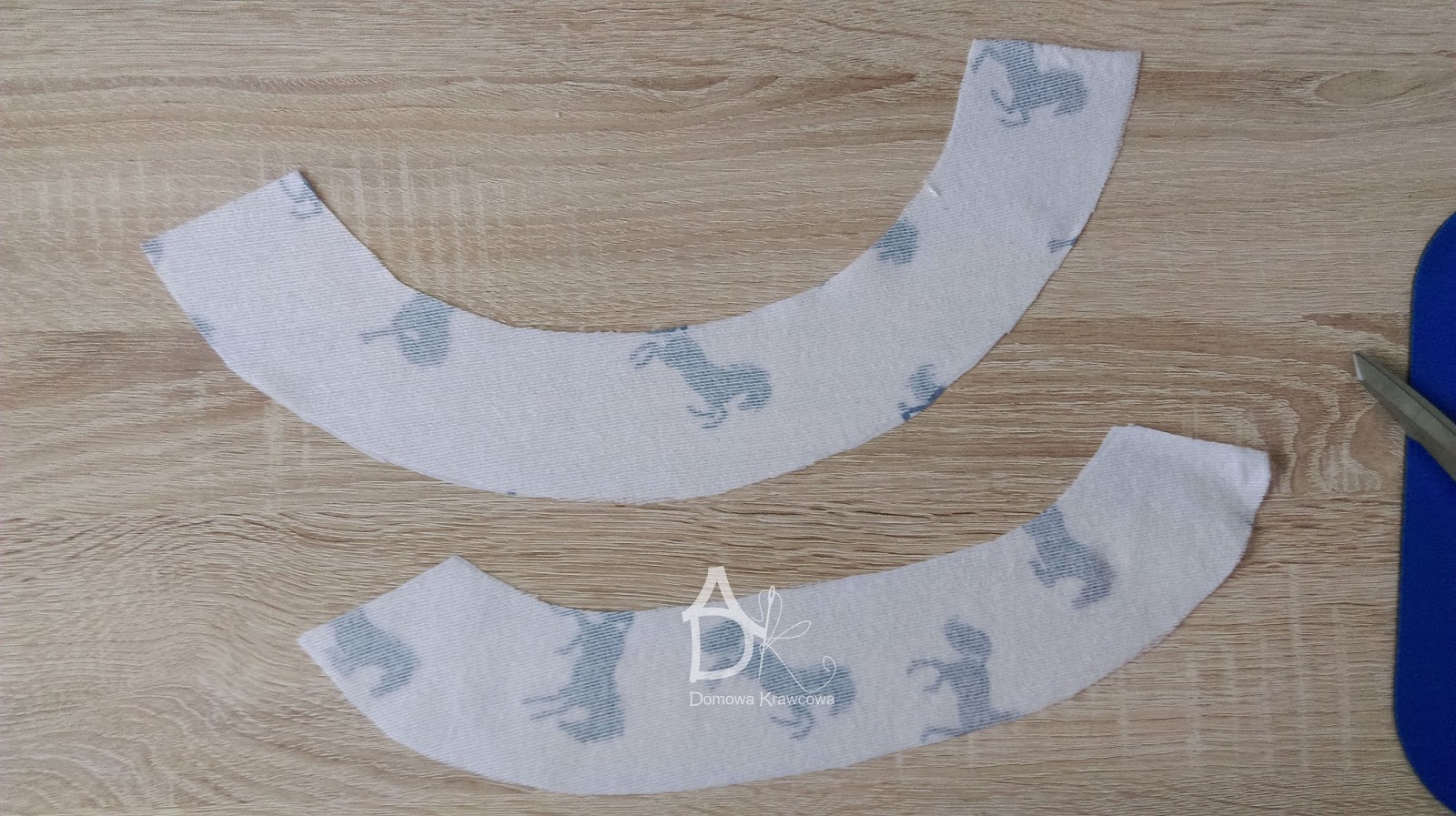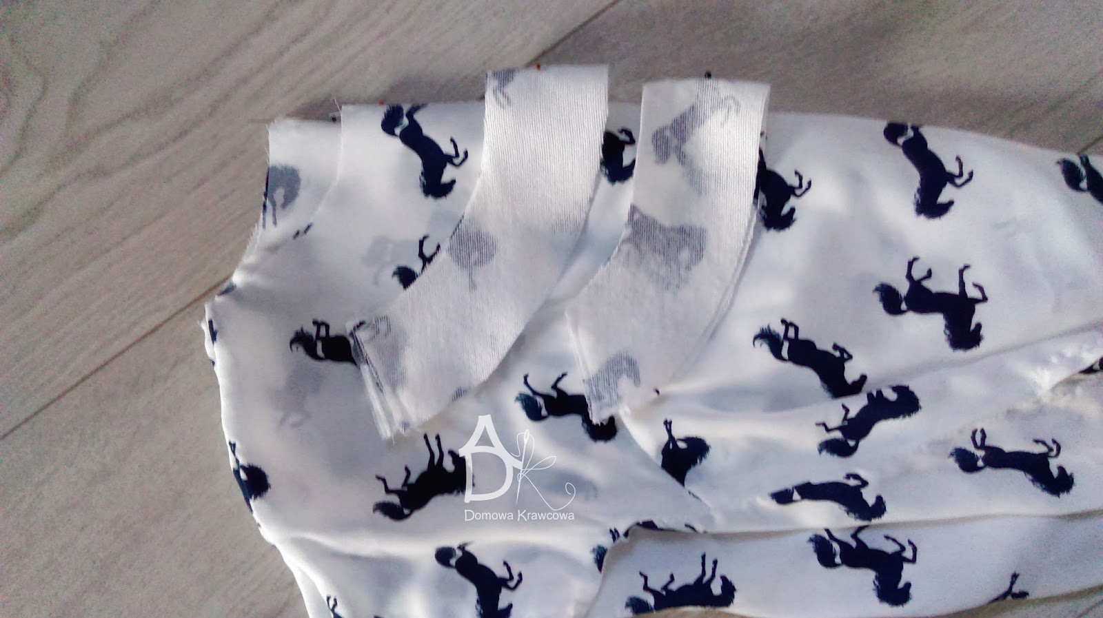 Ja szyłam z obłożeniem pod kroju szyi. Dlatego wycinam go przykładając przód połowy bluzki. Szerokość obłożenia 5cm.