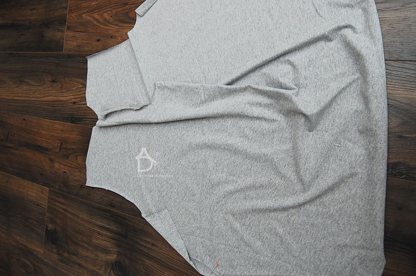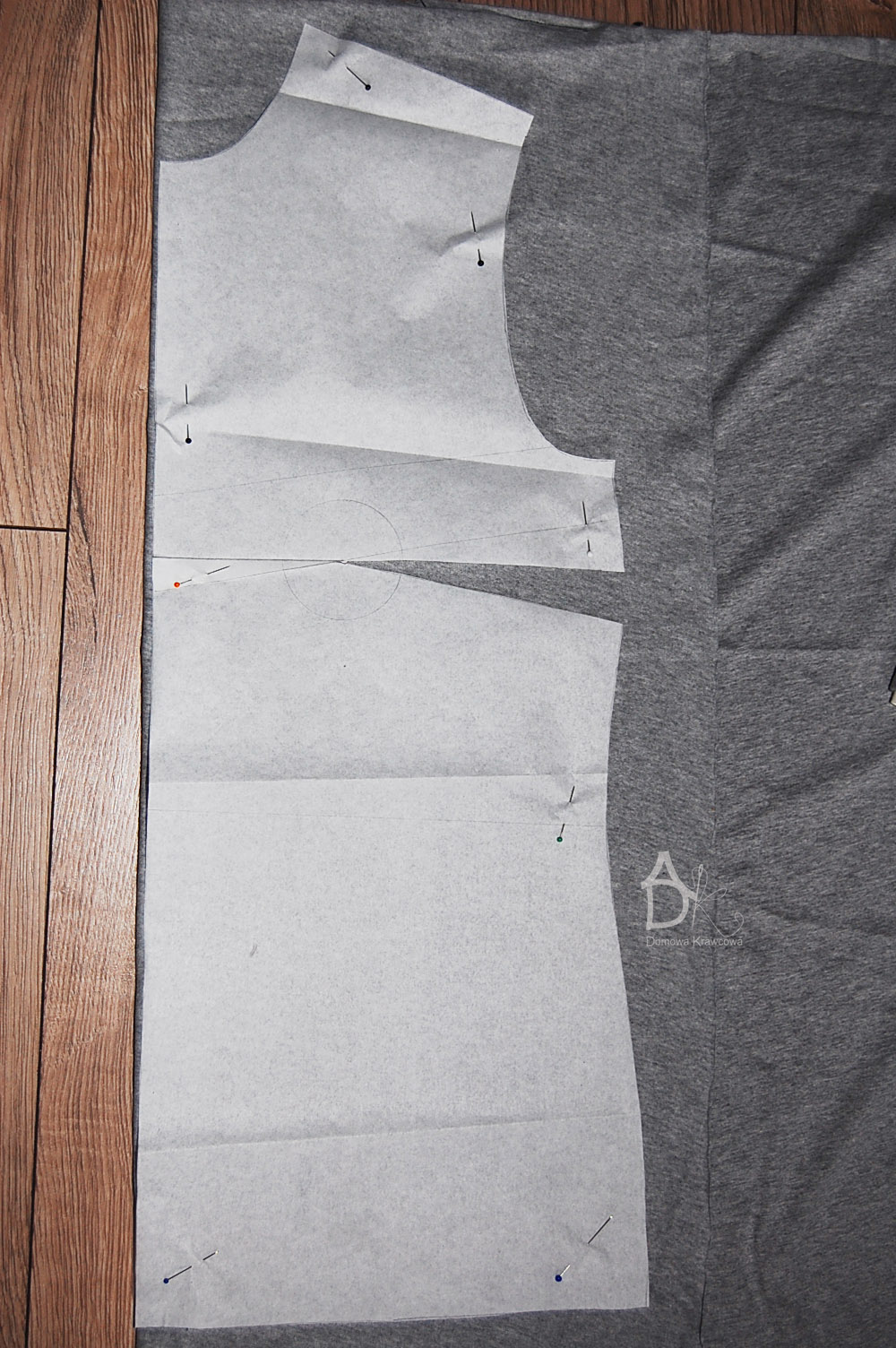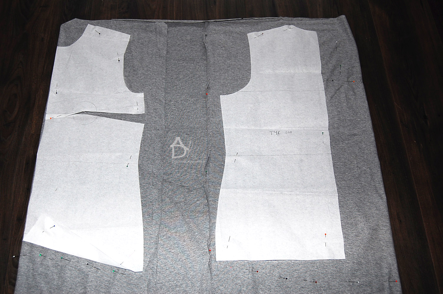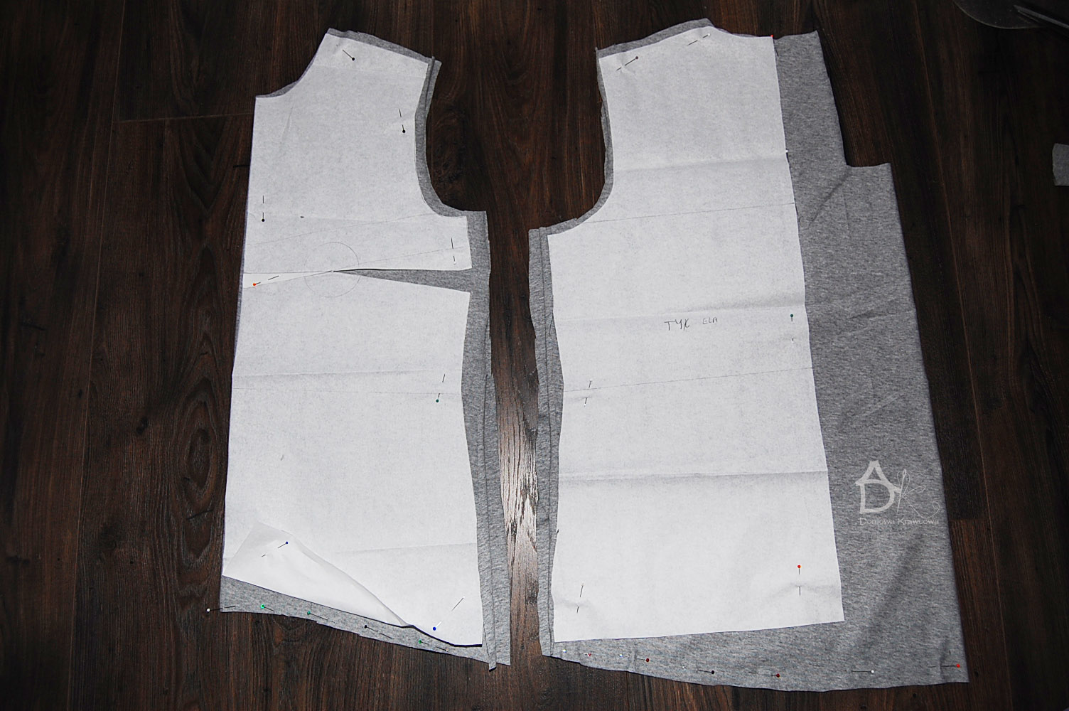 Składamy tkaninę po długości tak by przód i tył był na złożeniu materiału. Jak będziecie mieć wykrój z burdy to tam ten odstęp na kontrafałdę będzie na wykroju ja musiałam zrobić go na materiale ponieważ modeluje formę podstawową bluzki. Przypinamy szpilkami formę dodajemy na szwy 1,5cm, na podwinięcie dołu 3cm.
