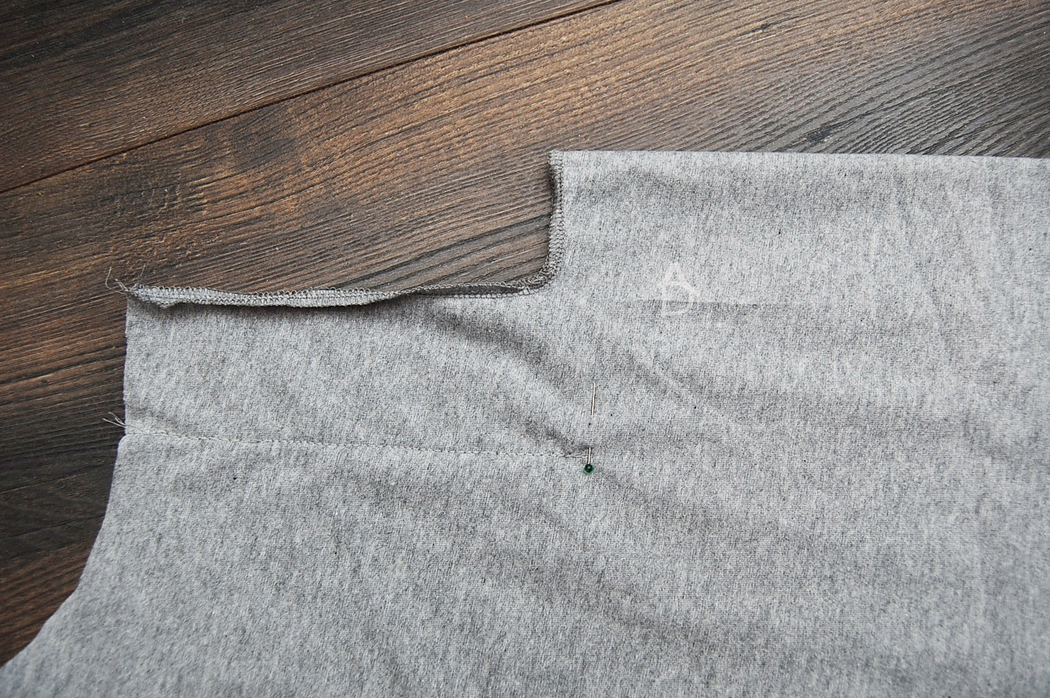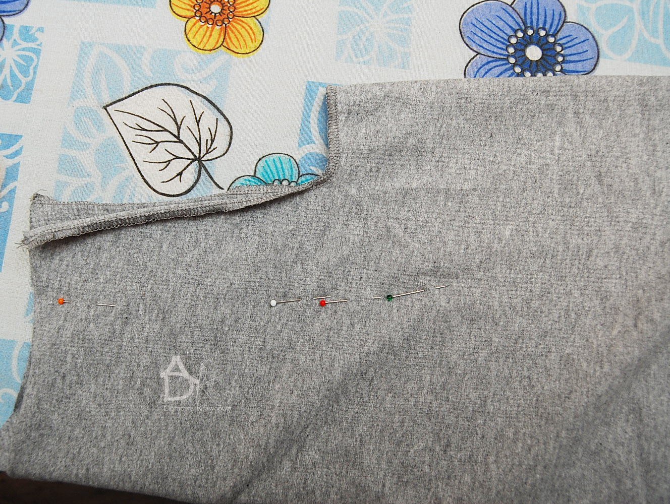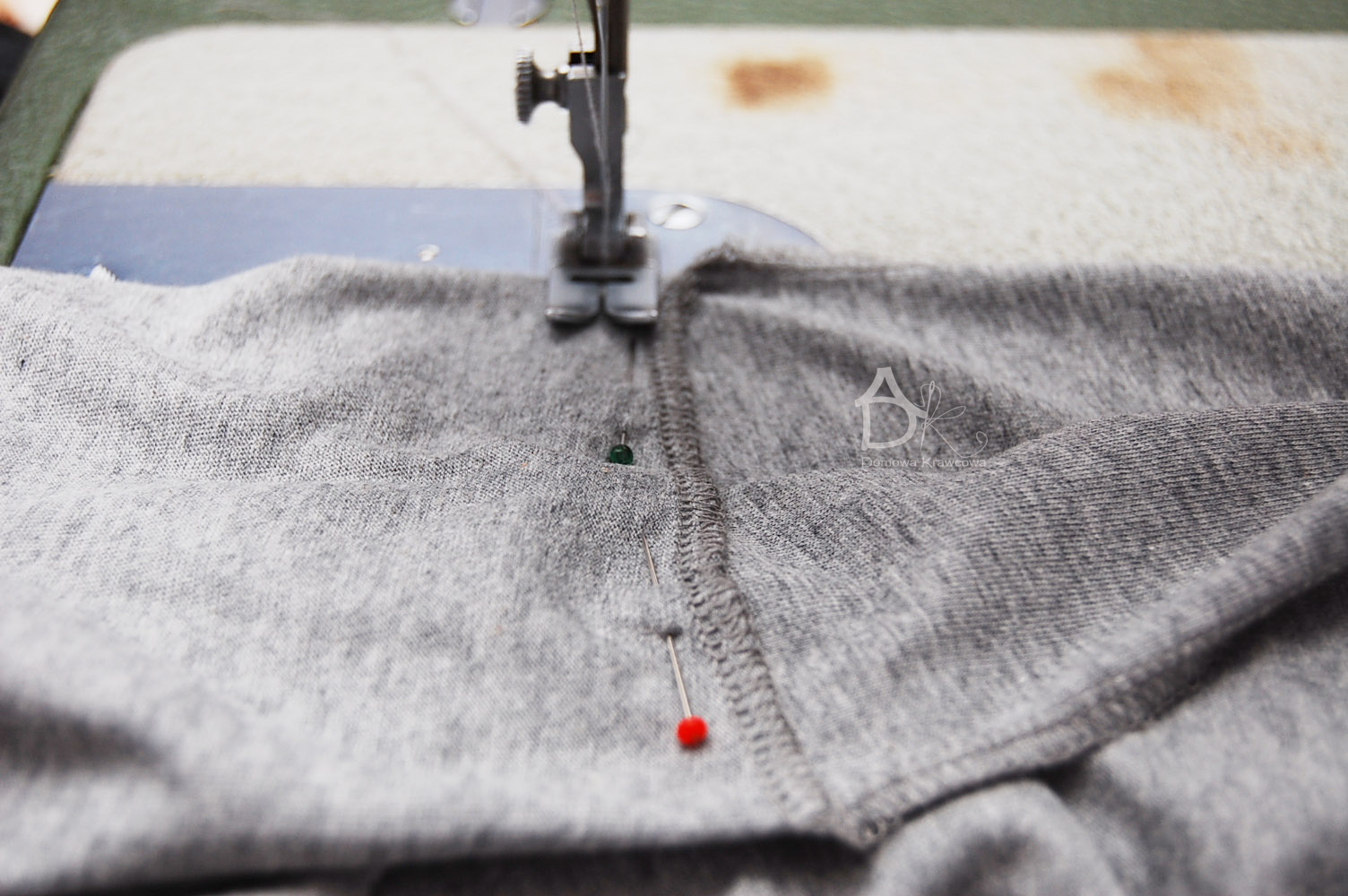 Następnie obrzucany overlockiem lub zygzakiem rozcięcie tyłu, spinamy miejsce zszycia kontrafałdy i zszywamy. Szpilkami zaznaczamy sobie koniec zszywania kontrafałdy.