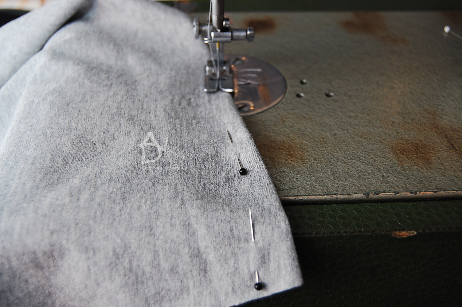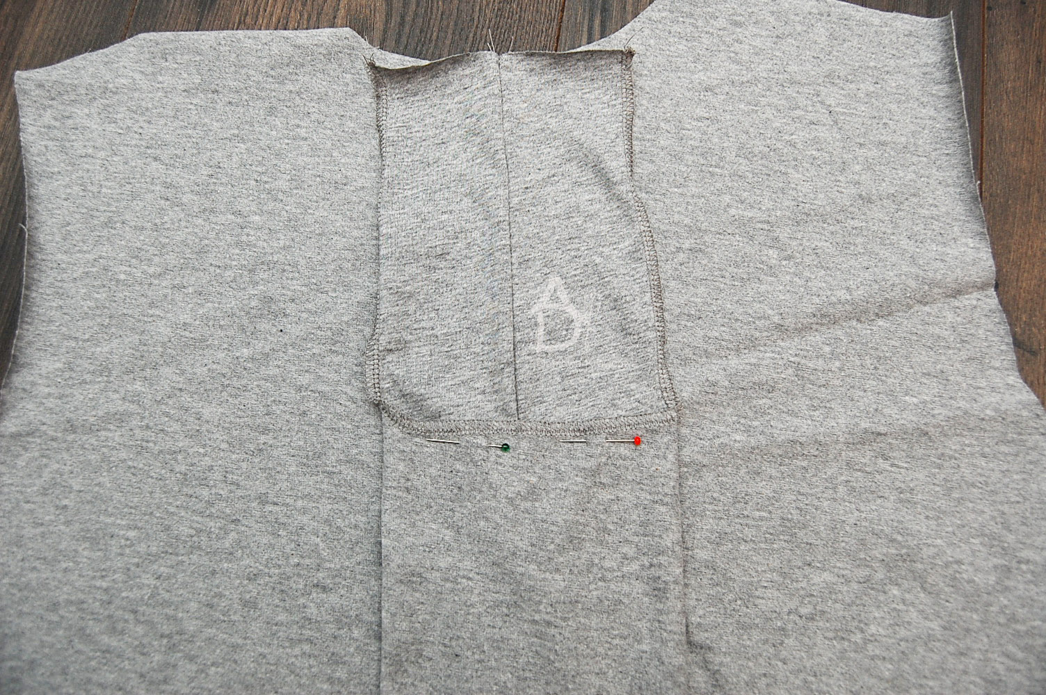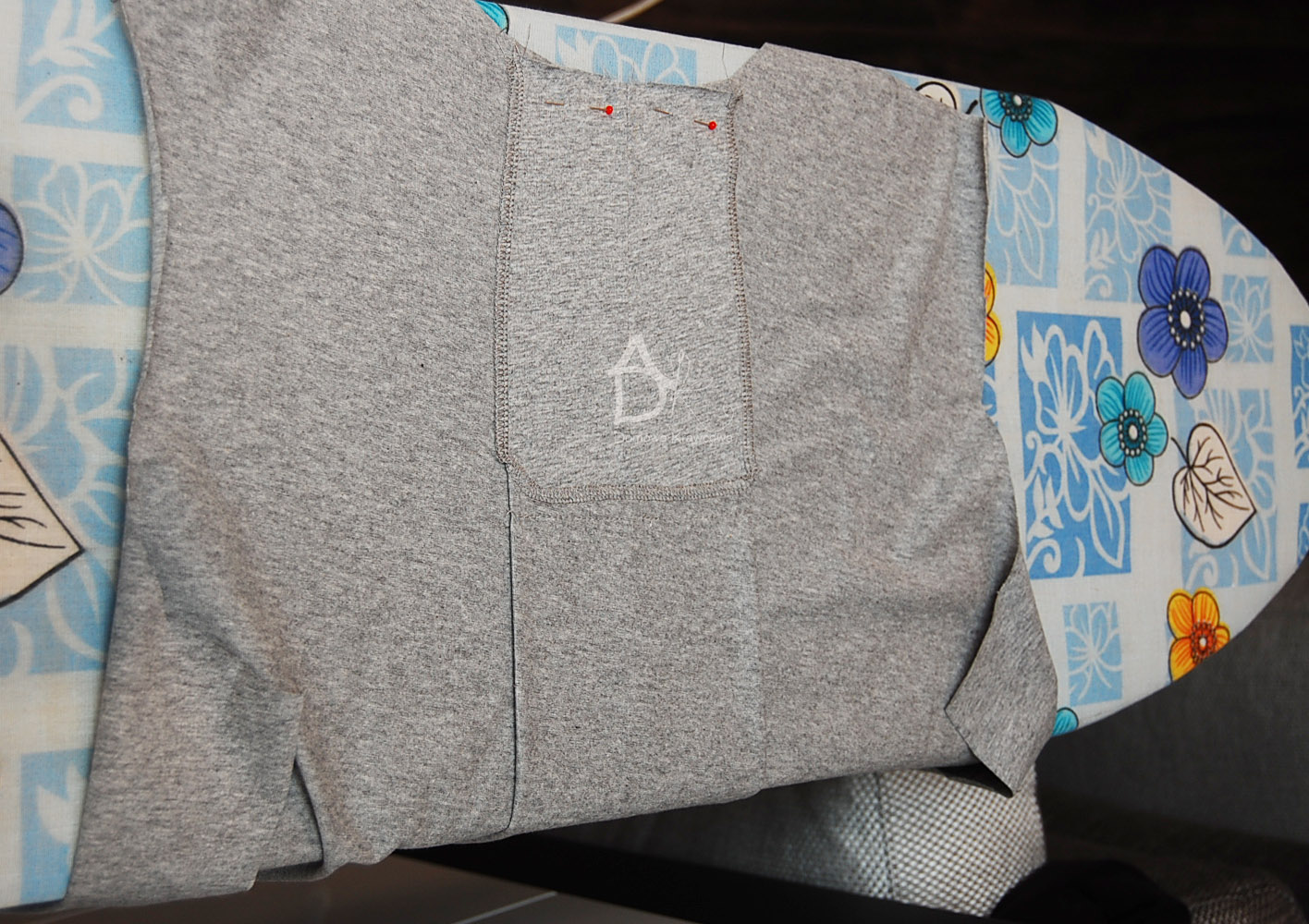 Następnie obrzucany overlockiem lub zygzakiem rozcięcie tyłu, spinamy miejsce zszycia kontrafałdy i zszywamy. Szpilkami zaznaczamy sobie koniec zszywania kontrafałdy.