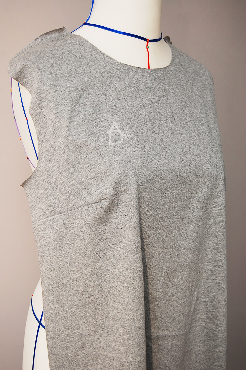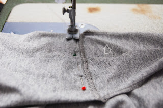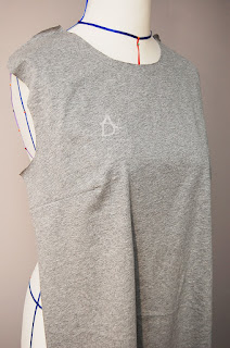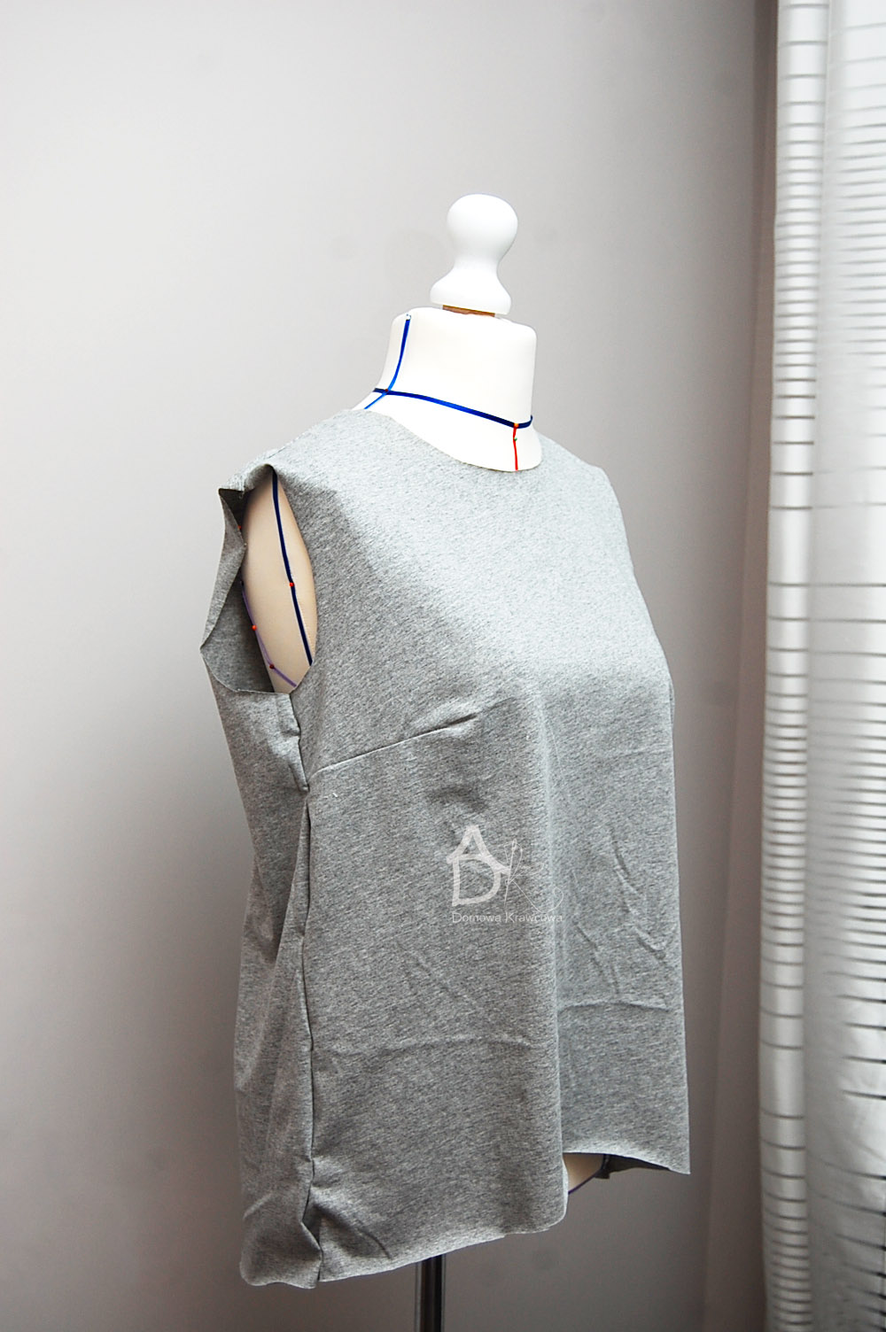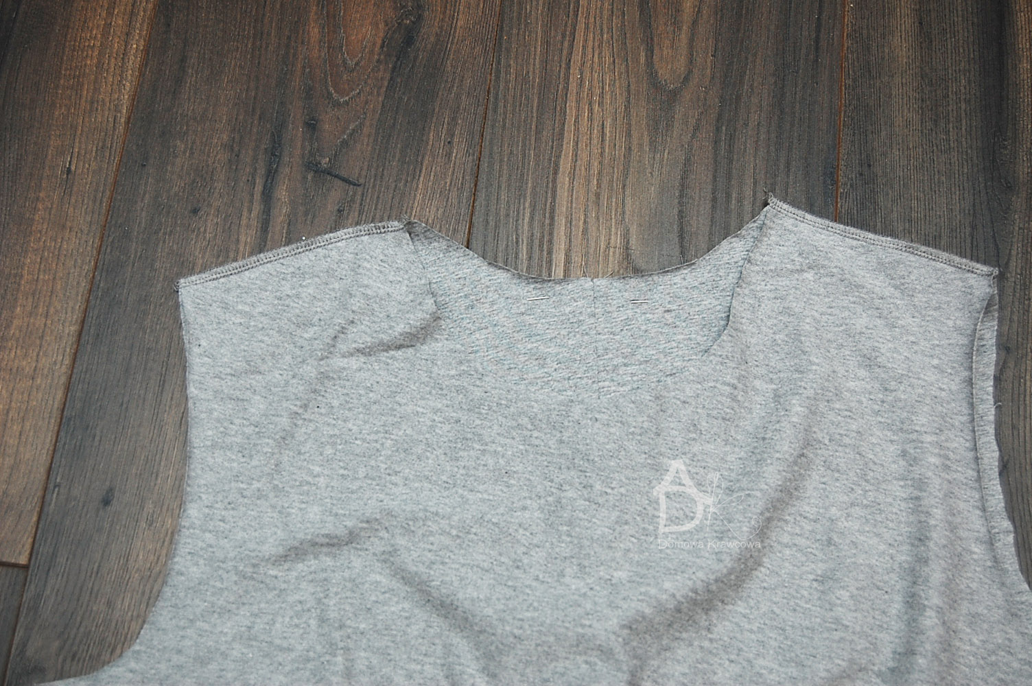 Jak jest manekin lub można przyłożyć bluzkę do siebie i sprawdzić jak leży zaszewka i czy ładnie jest zeszyta i zaprasowana. Następnie spinamy szpilkami przód z tyłem ramiona i zeszywamy ja to robię overlockiem 4 nitkowym który i obrzuca i jednocześnie zeszywa.