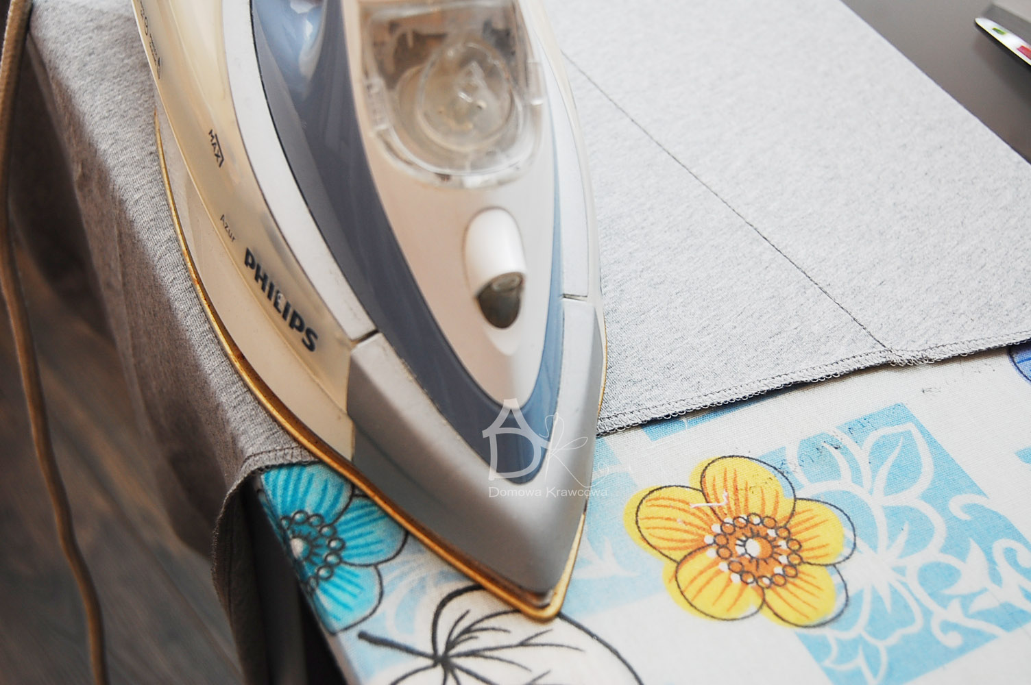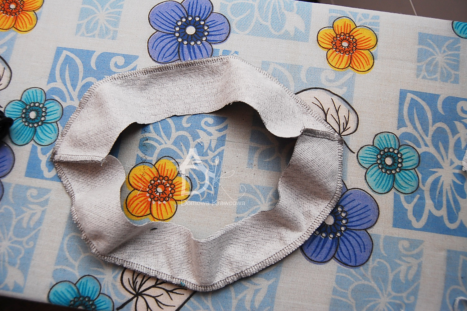 Zawsze jak kroisz flizelinę zrób ją większą następnie jak przeprasujesz nadmiar proszę wyrównać. Zeszyć na overlocku 4 nitkowym ramiona oraz obrzucić dół obłożenia. Jeżeli nie masz overlocka to zszyj na stebnówce długość ściegu 4 lub zygzakiem by nie pękały szwy i obrzuć zygzakiem dół.