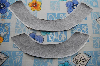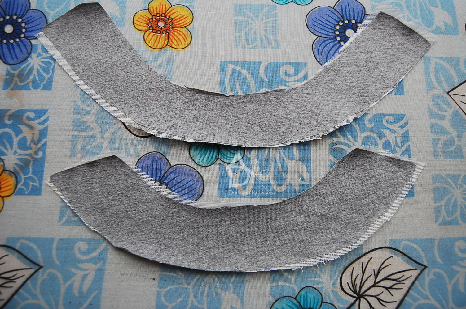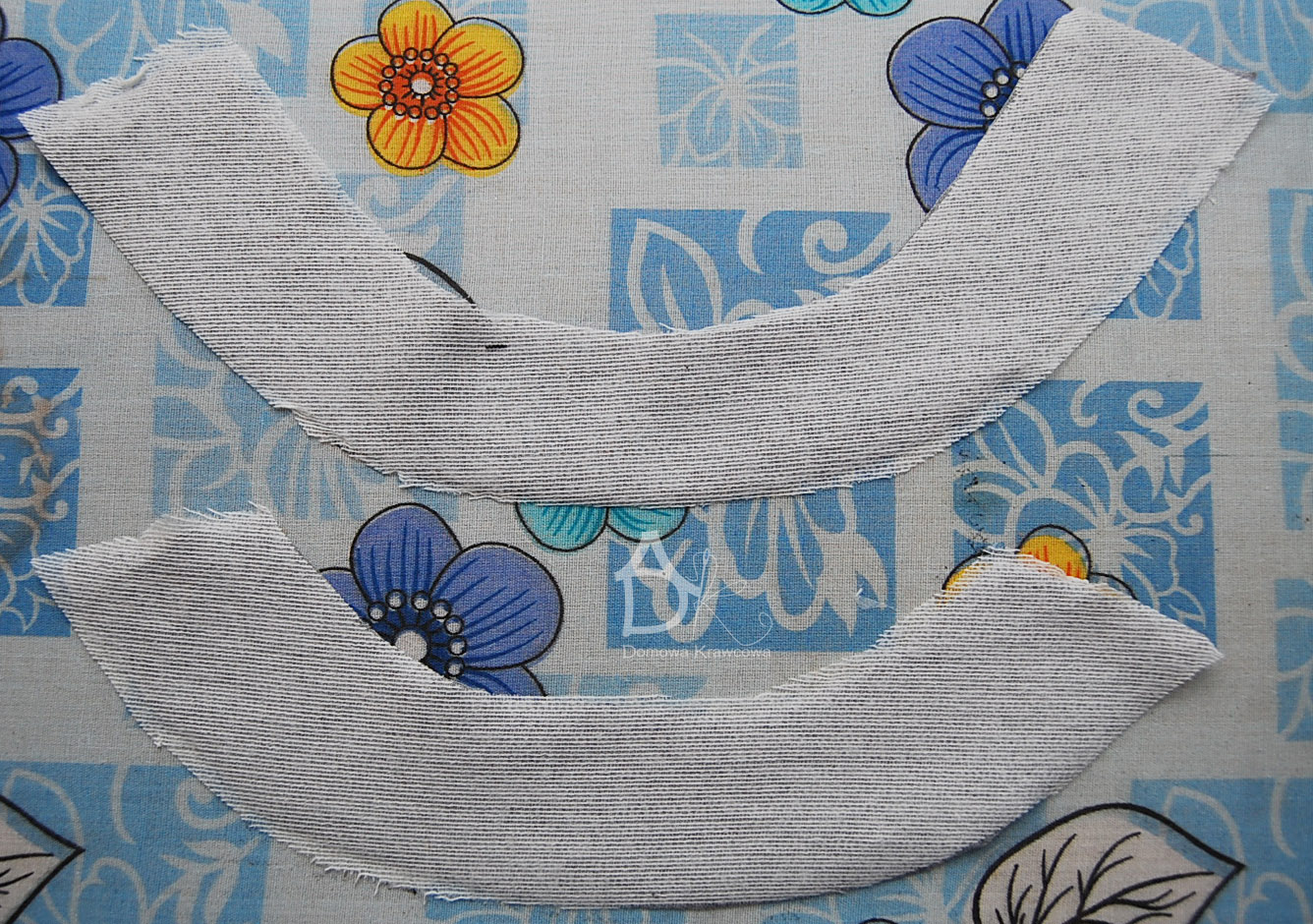 Wycinam z tkaniny również obłożenie podroju szyi przodu i tyłu. Oczywiście muszę wzmocnić obłożenia flizeliną, ja wzięłam dzianinową bo lepiej się układa, temperatura żelazka 150 stopni.