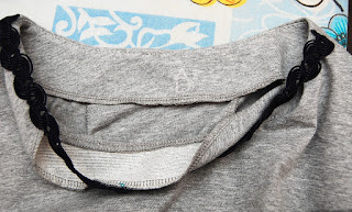 By łatwo i ładnie nam się układało obłożenie należy je ostebnować ściegiem prostym 1mm od brzegu podkroju po stronie obłożenia. Ja oczywiście jeszcze doszyłam sobie koronkę w koło szyi , ale wy tego nie musicie robić. Jeżeli jednak zechcecie to należy to zrobić nim zeszyjecie ramiona umocować tam tasiemkę. Ja układać ją będę i przyszywać do podkroju teraz jak mam obsadzenie wszyte bo zobaczę jak się układa.