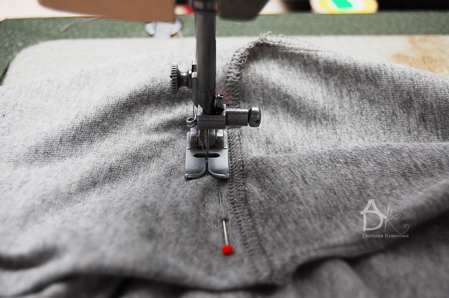Następnie spinam szpilkami boki bluzki i zeszywam np.: stebnówką ustawienie zygzak na 4 długość ściegu też na 4. Przymierzam bluzkę i patrzę jak leży czy długość jest odpowiednia, jeżeli za długa to skracam pamiętaj, że 3 cm należy zostawić na podwinięcie.