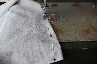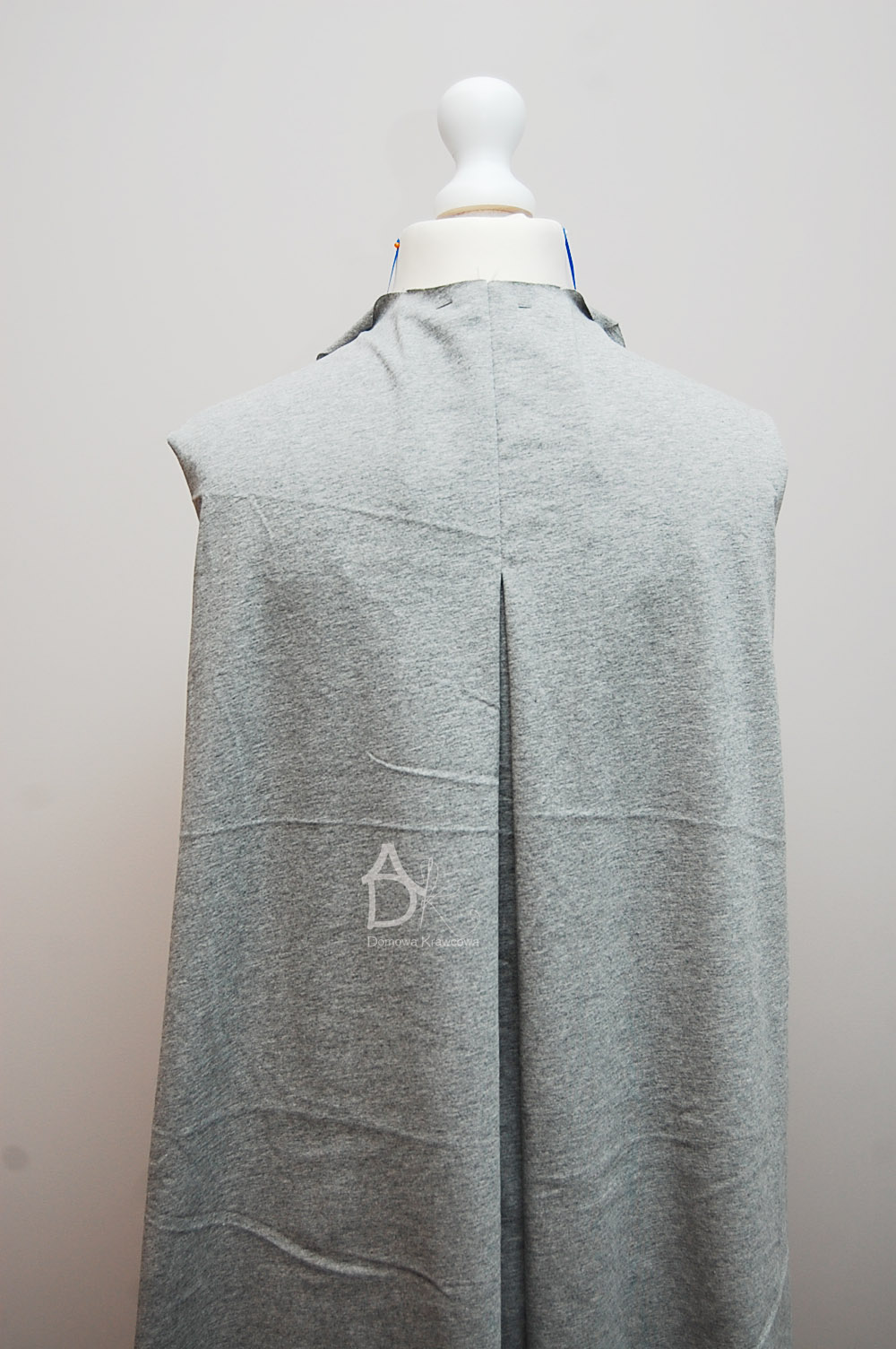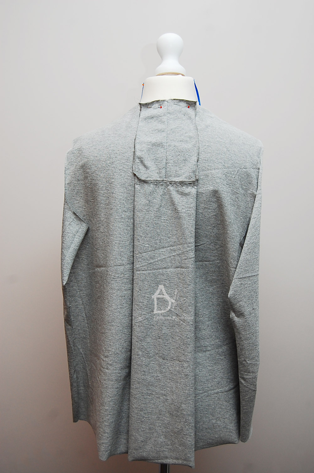 Teraz należy kontrafałdę złożyć na pół najwygodniej ją pospinać by nam się nie rozchodziła. Szpilkamy mocujemy sobie miejsce przeszycia kontrafałdy i zszywamy raz z jedenej strony do połowy zeszycia pleców następnie z drugiej strony do połowy pleców.