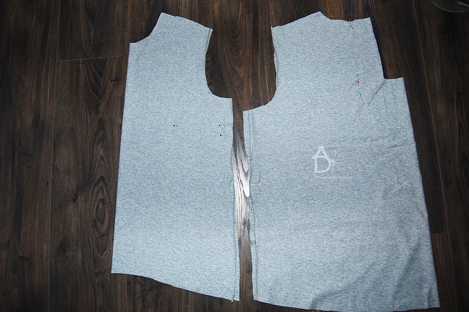 Tak wygląda po wycięciu zaznaczamy na przodzie szpilkami miejsce wykonania zaszewek piersiowych, zaznaczamy na formie tyłu szpilkami zeszycie kontrafałdy, na rękawie zaznaczam szpilkami przód rękawa i środek mocowania kuli.
