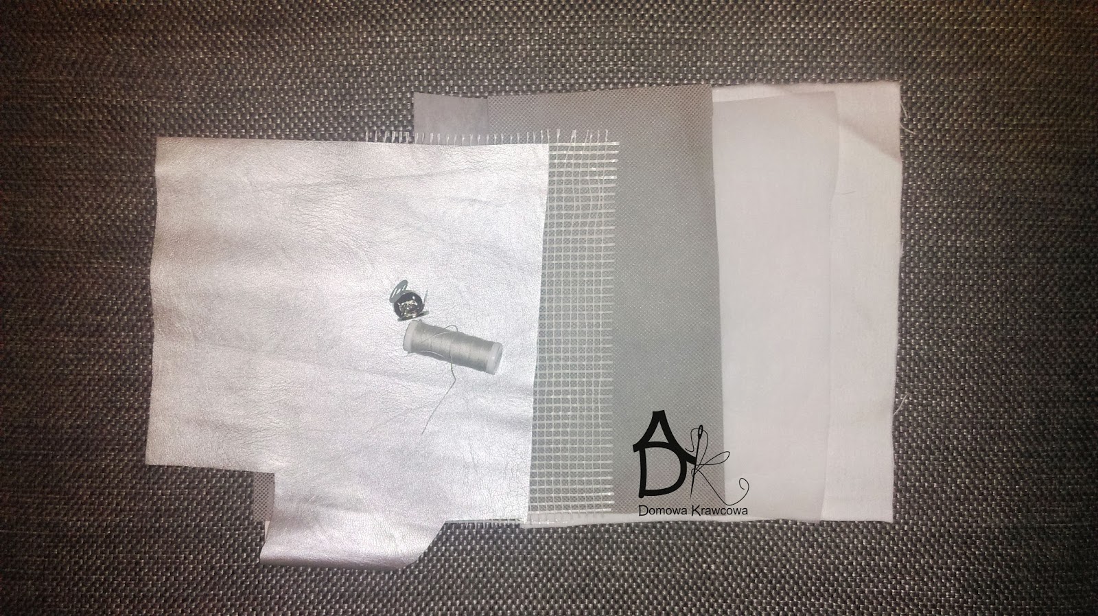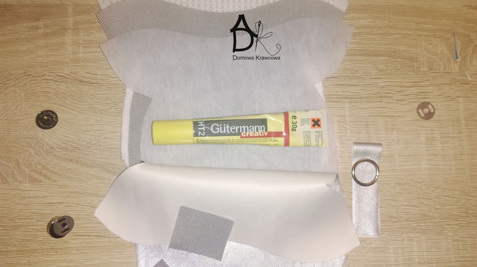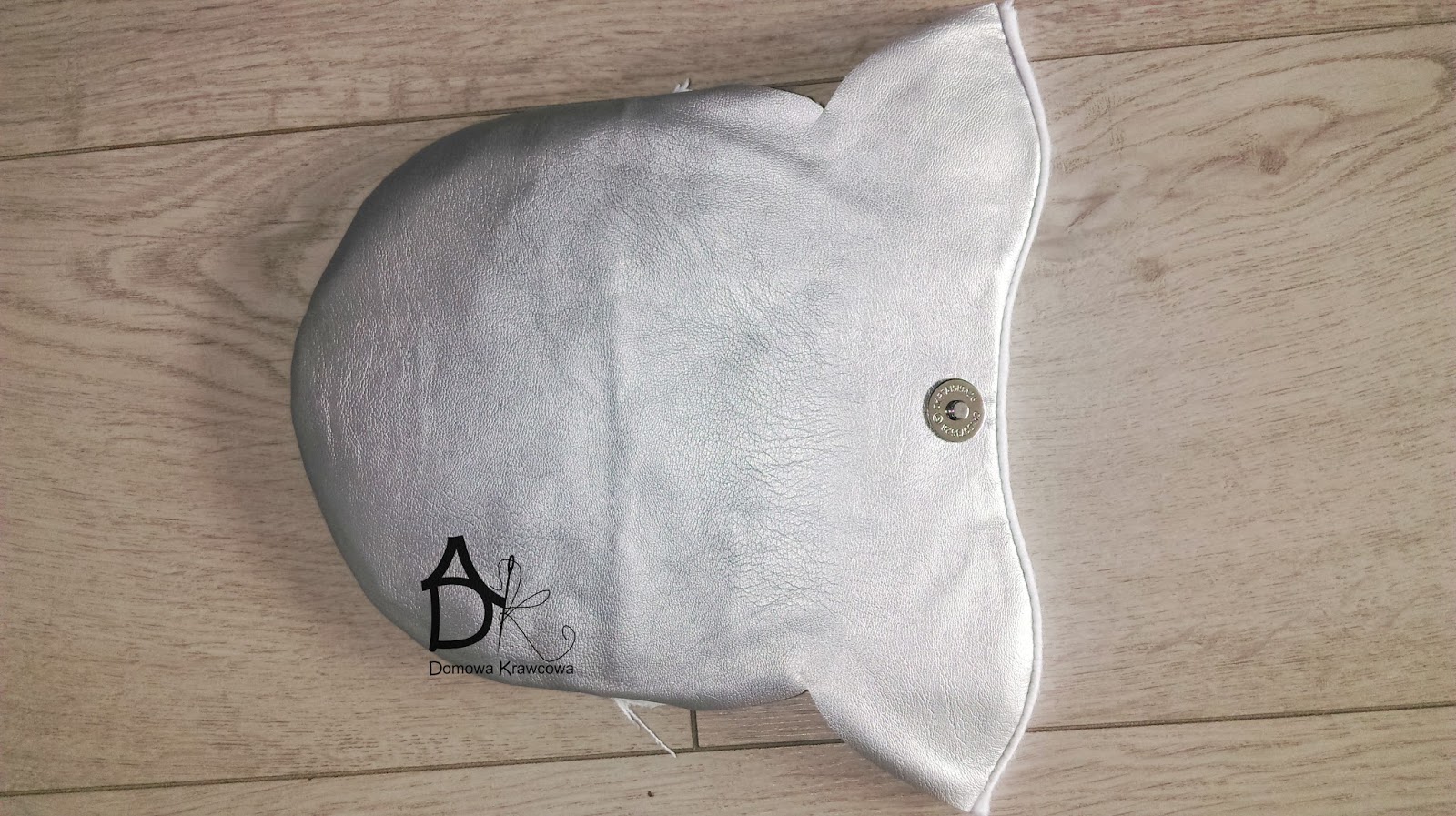 Miałam resztki tkaniny srebrnej 26cm na 26 cm, flizelinę i usztywniacz, a do wyłożenia w środku wzięłam flanelę. Zamknięcie magnetyczne i nici do jeansu oraz klej do tkanin.