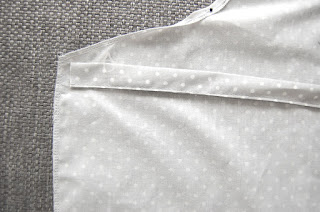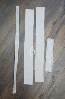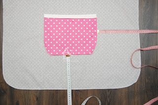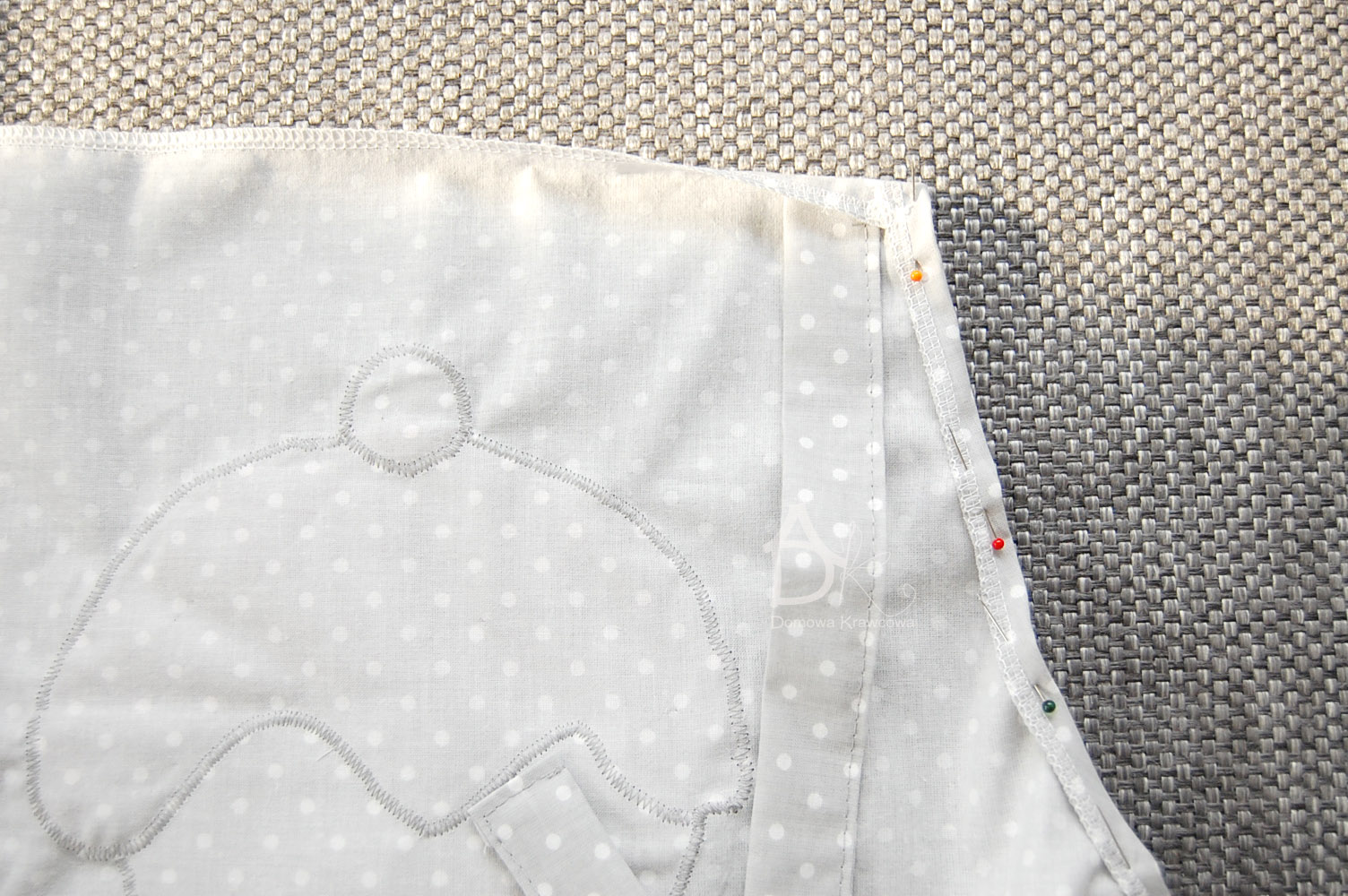 Przypinam pasek długości 20cm na górze fartuszka przykrywamy brzegiem fartuszka podnosimy do góry i przypinamy, tak przypinamy pozostałe paski i na szerokość 1cm podwijamy brzeg fartuszka po całości.