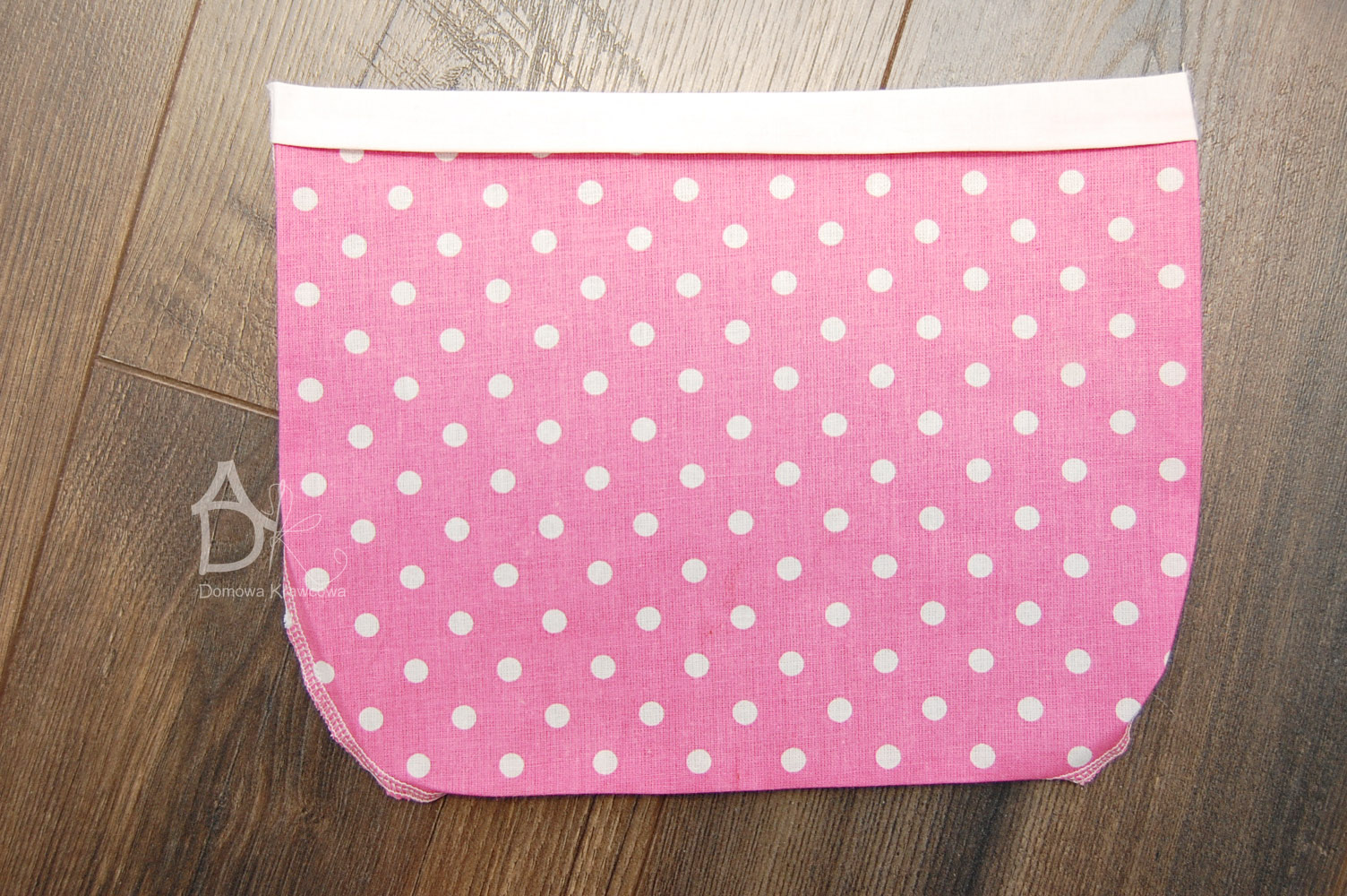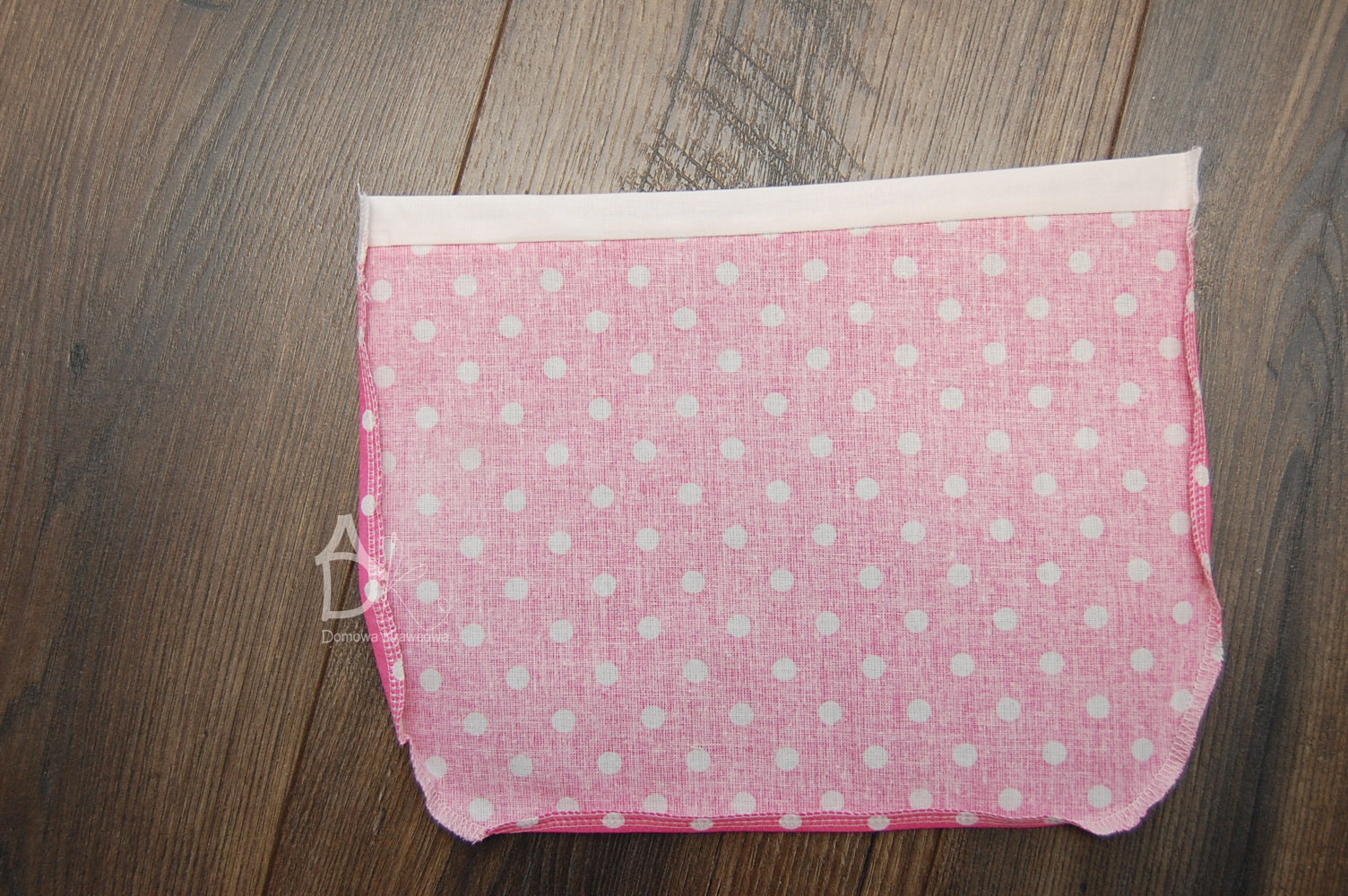 Kieszonkę górą obszywamy białym paskiem, który przyszywamy prawą strona do lewej, a następnie składamy  na pół i przewijamy na prawą stronę zaprasowujemy by łatwiej było przyszyć. Następnie obrzucamy overlockiem   kieszonkę w koło.