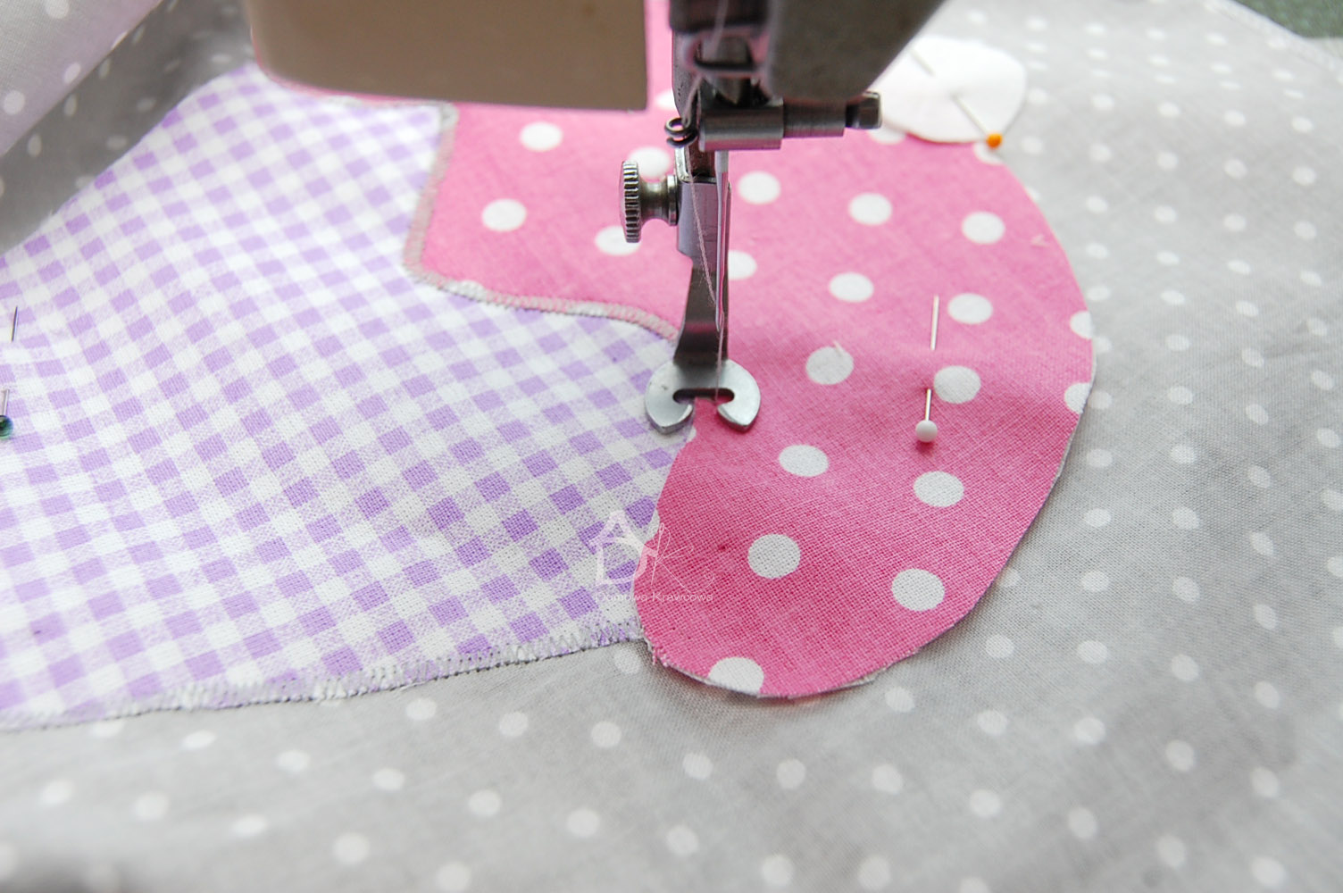 Aplikację mam  wyciętą i podklejoną układam na fartuszku i przypinam szpilkami. Używam do przyszywania aplikacji stopkę do guzików. Wykonuje to ściegiem zygzakowym szerokość ściegu 3 długość prawie zero na zdjęciu dolny pokazuje ustawienie.