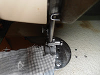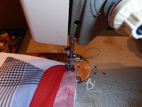 Ostatni etap to przyszycie podwiniętej stójki robimy to bardzo dokładnie i równo. Ja zmieniam stopkę na węższą do szycia prostego i wtedy brzeg lewego wąsa stopki prowadzę po brzegu stójki.