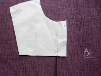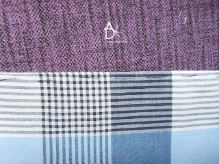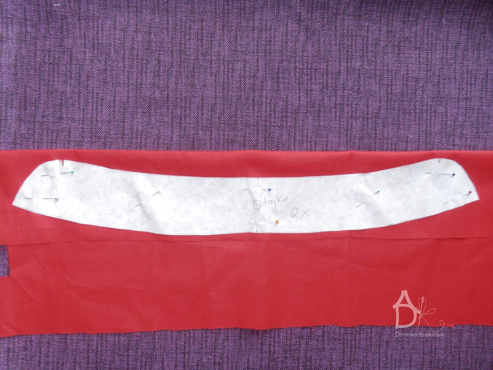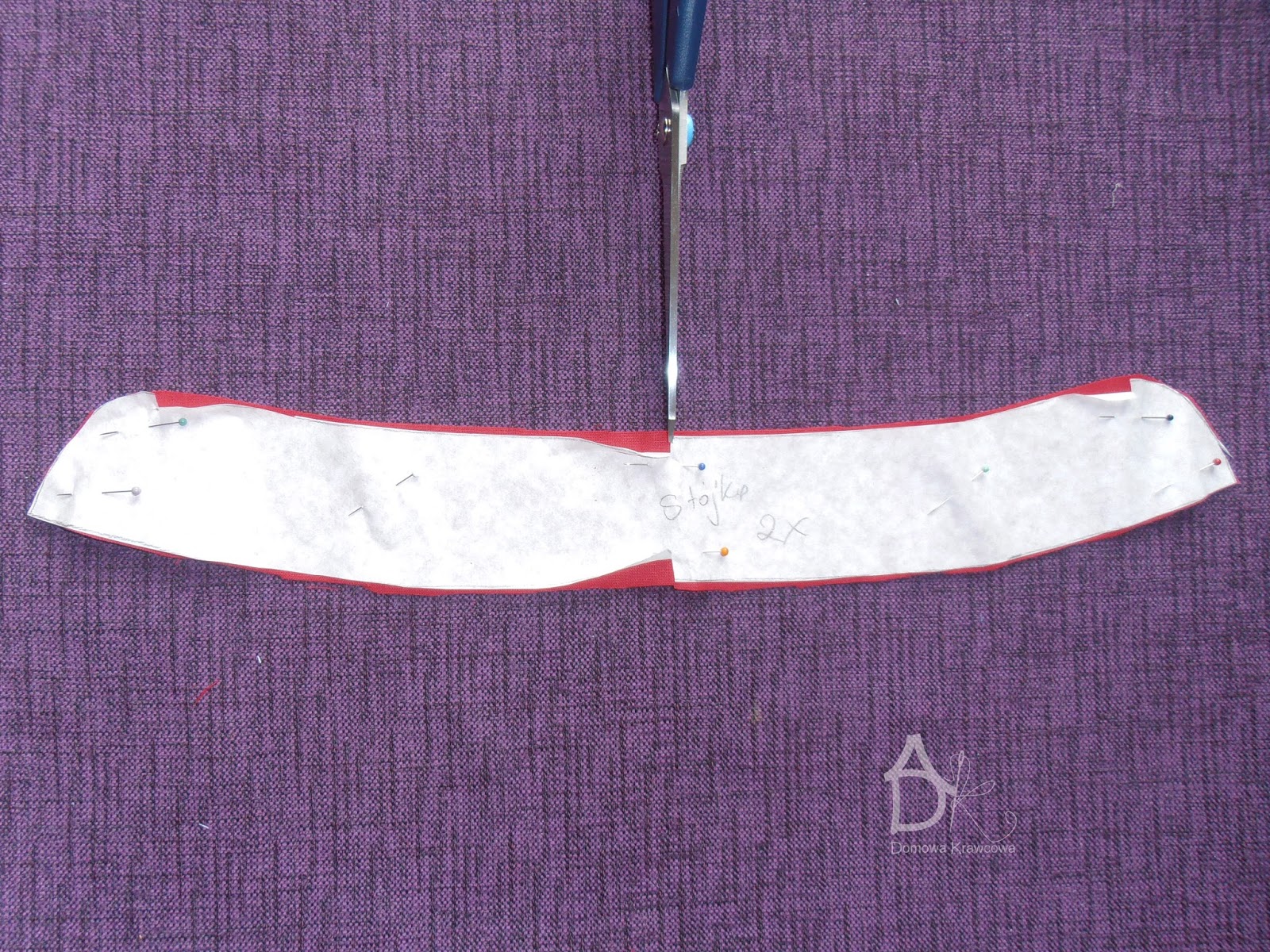Poprzypinaj do tkaniny i powycinaj uwaga na nitkę prostą. Pozaznaczaj nożyczkami nacinając środek kołnierzyka i stójki. Każdą części kołnierzyka ze stójką zrobiłam w innym kolorze by łatwiej było rozpoznać daną operację.