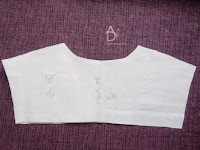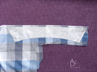 Na przodach koszuli zaznaczamy linię środka bluzki i linię zapięcia dziurek i guzików. Następnie wzmacniamy klejonką miejsce zagięcia. Obrzucamy overlockiem lub zygzakiem brzeg środka koszuli, drugi sposób zaprasowujemy brzeg koszuli na 7 mm do lewej a następnie będzie to stebnowane, ale to później.