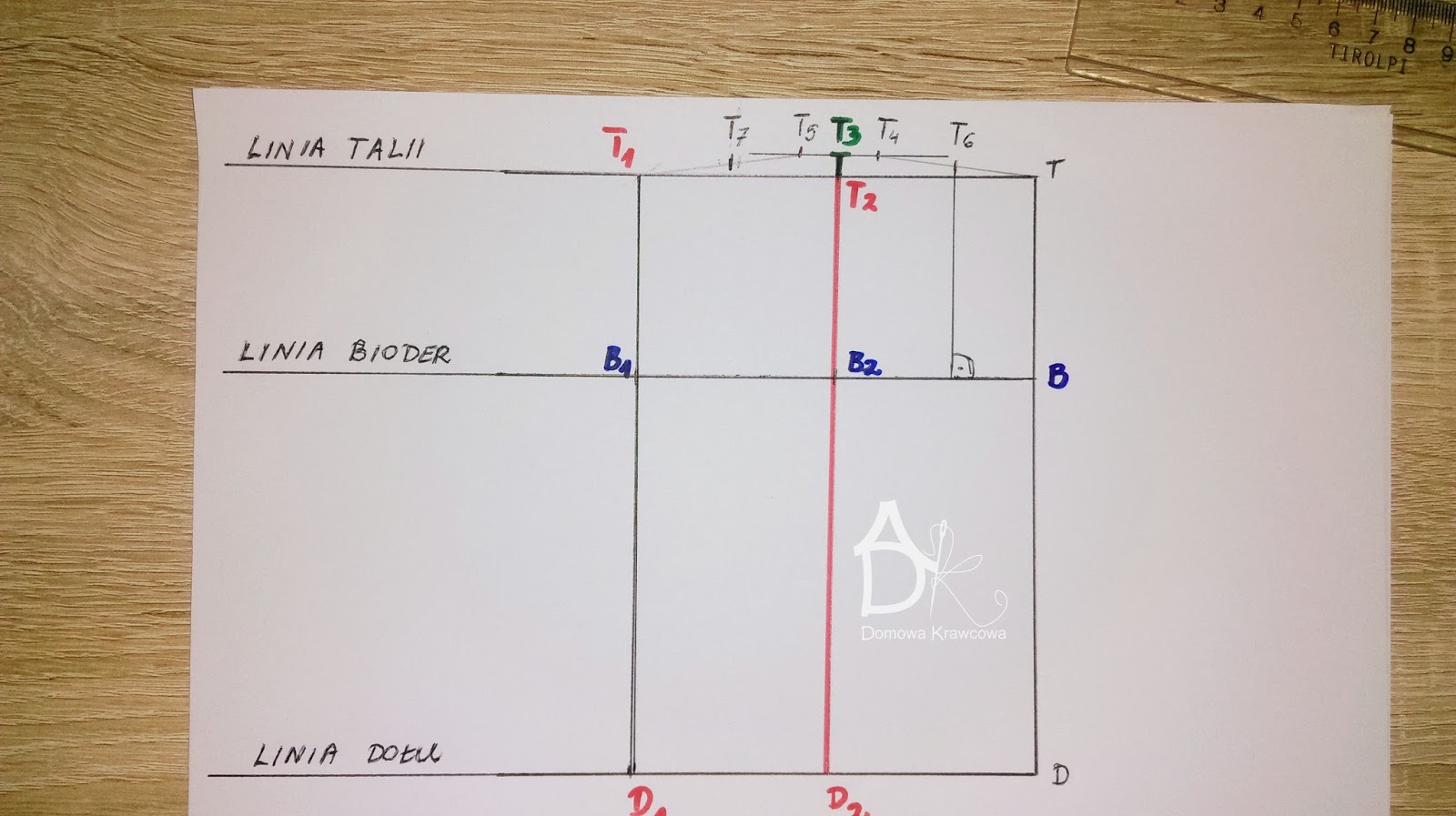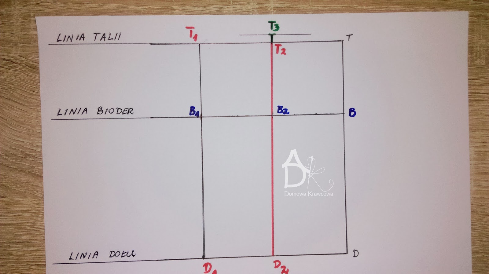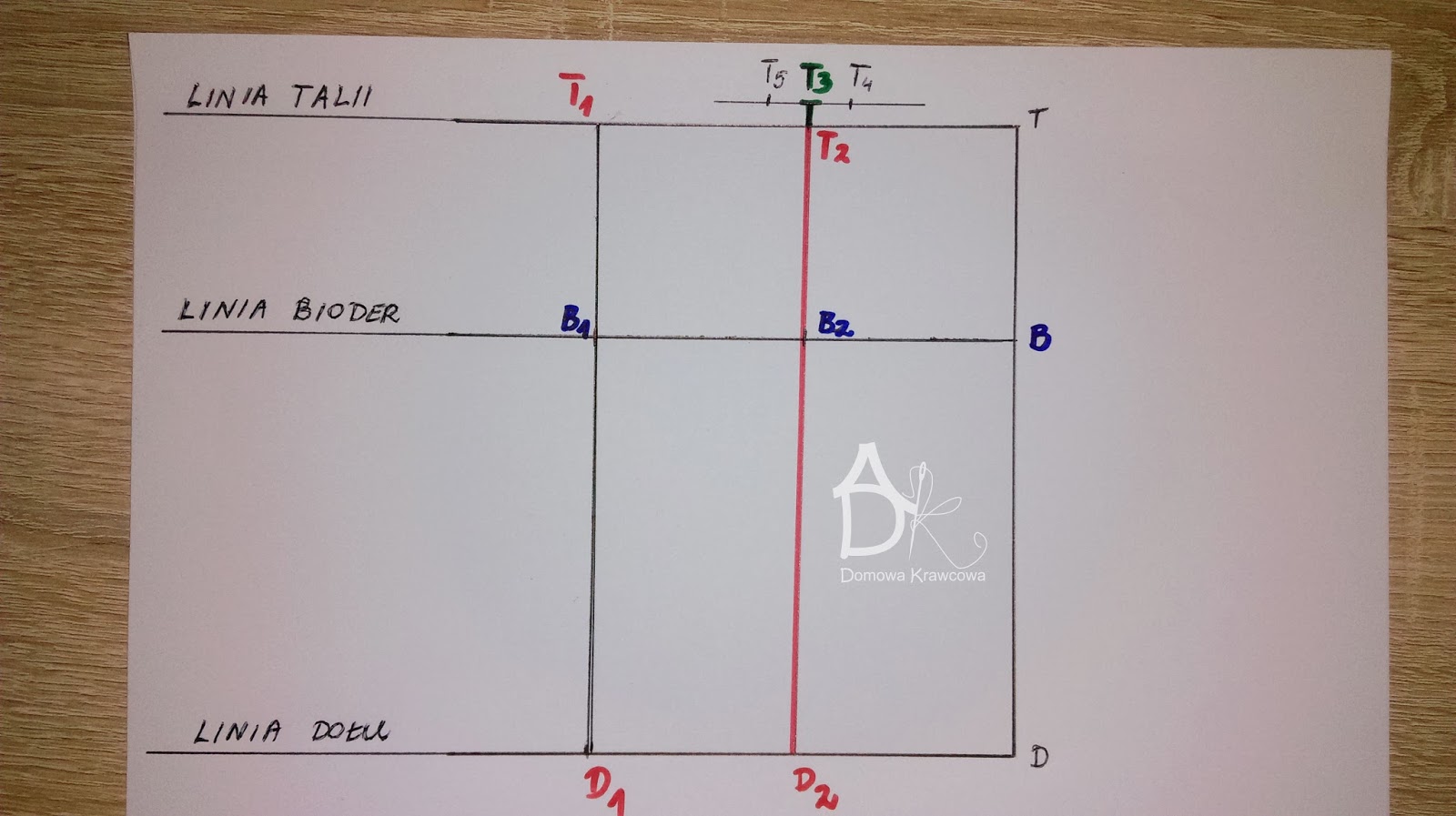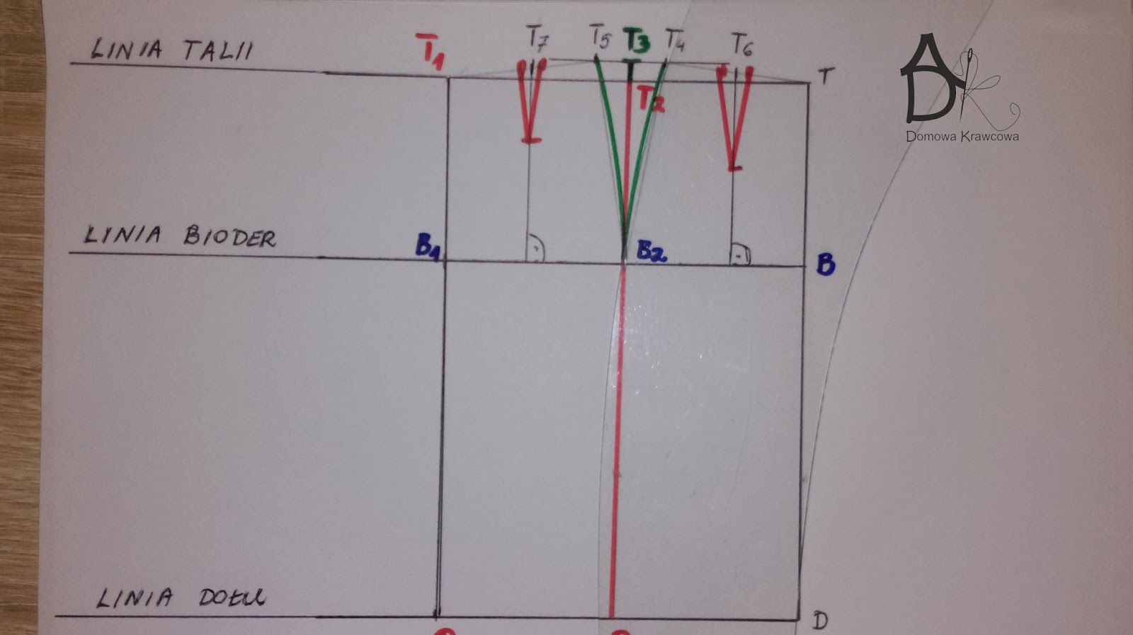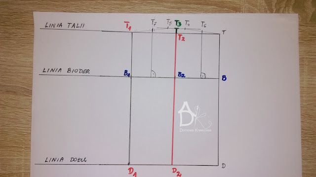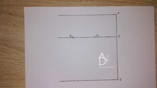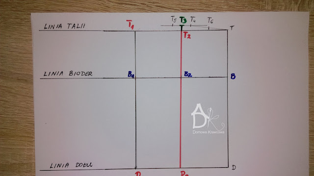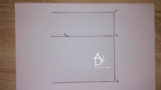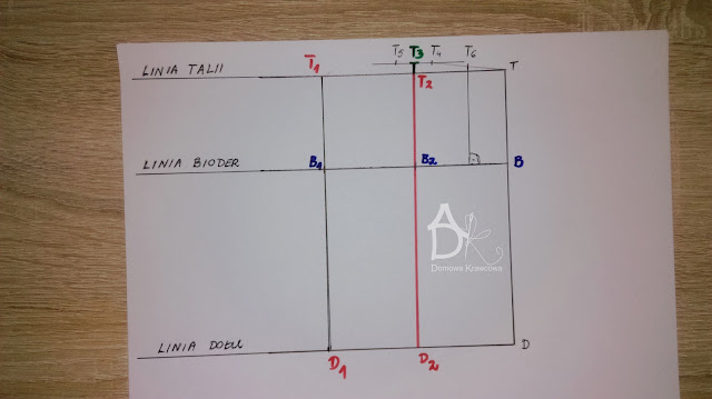 Od pkt T odmierzamy  pionowo w dół długość spódnicy do pkt D czyli TD = 52 cm. Następnie od pkt D wykreślamy prostą prostopadłą do TD jest to nasza linia dołu.