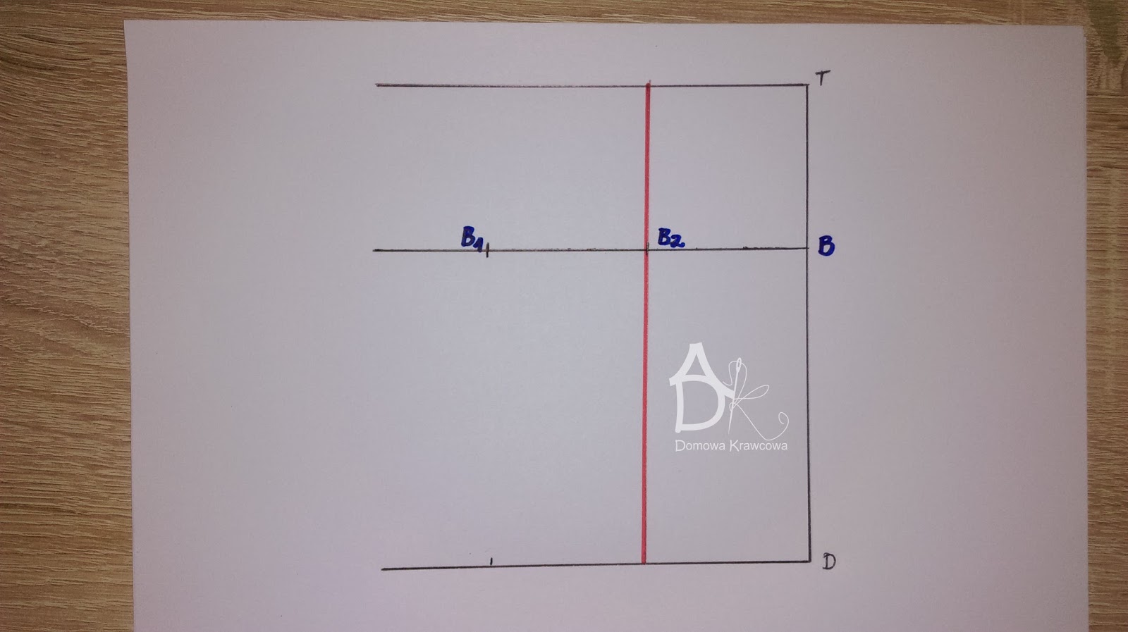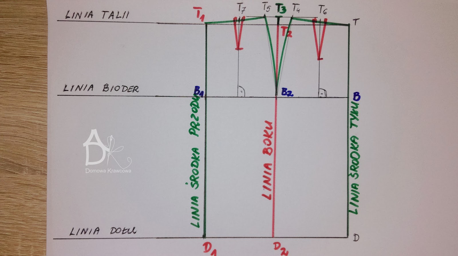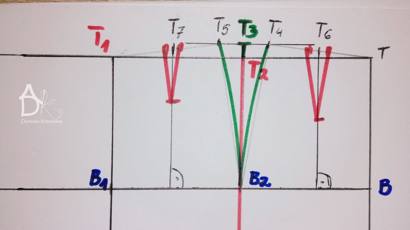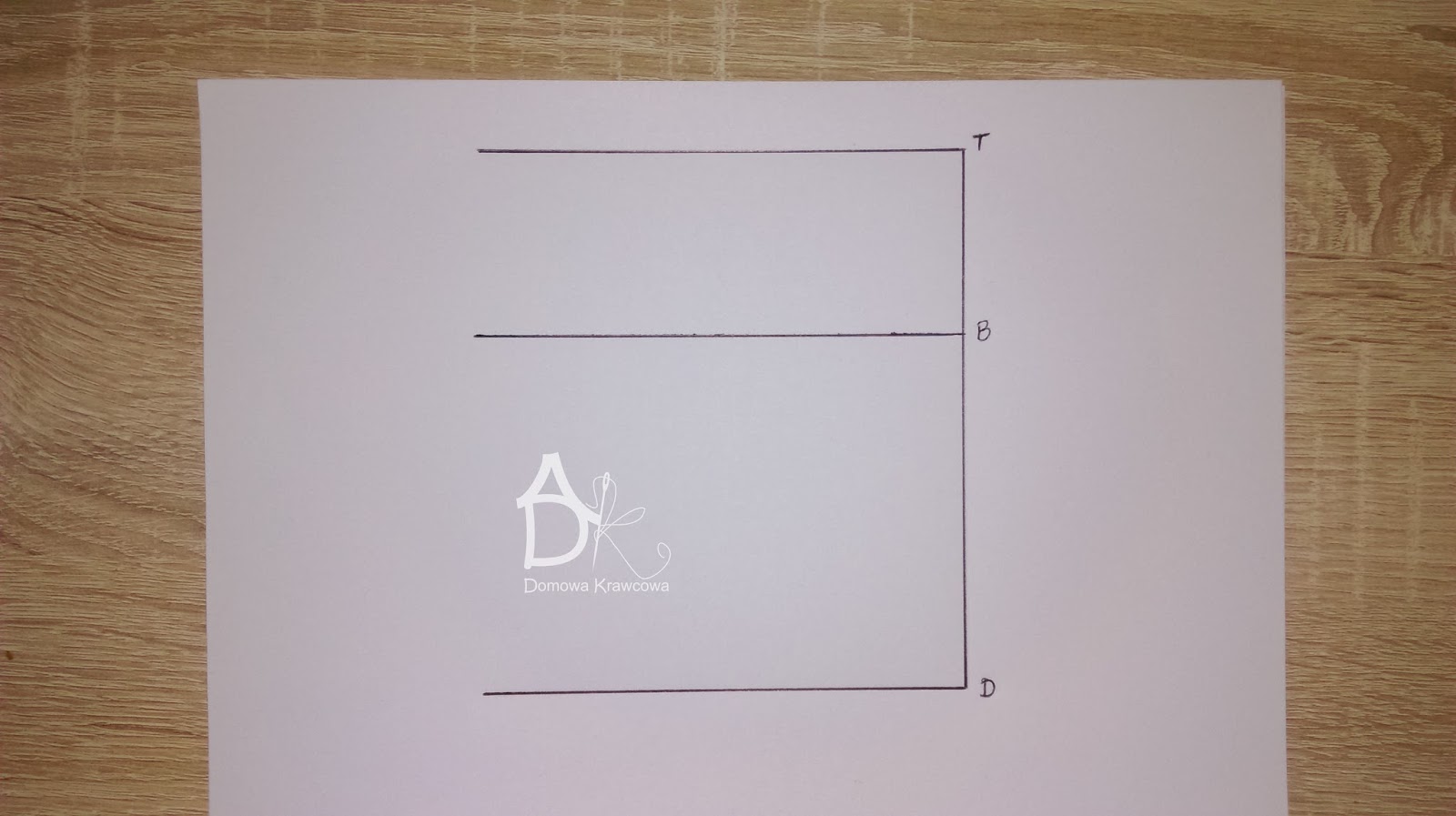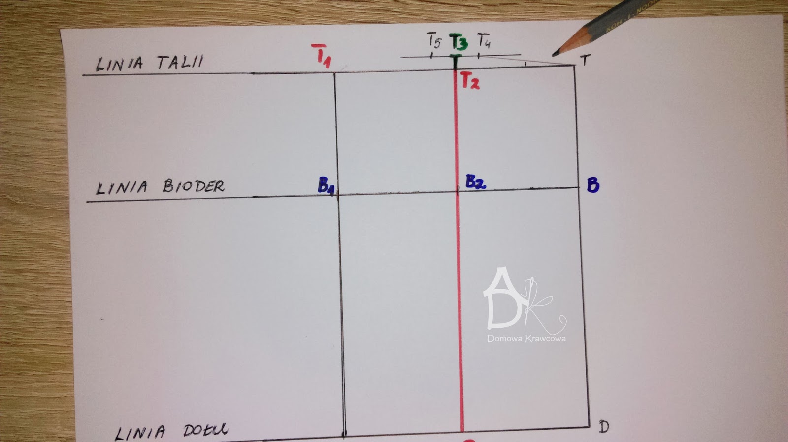 Od pkt T odmierzamy  pionowo w dół długość spódnicy do pkt D czyli TD = 52 cm. Następnie od pkt D wykreślamy prostą prostopadłą do TD jest to nasza linia dołu.