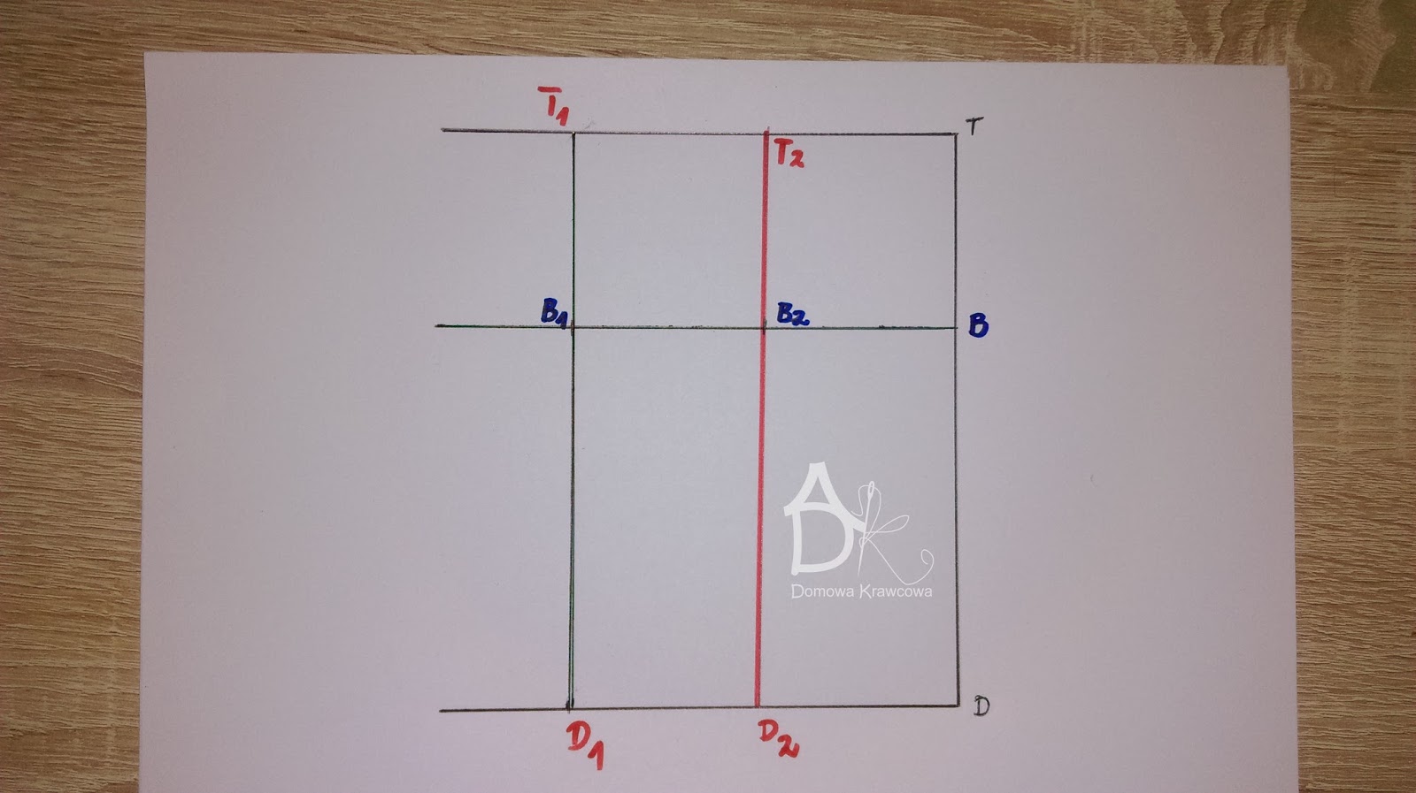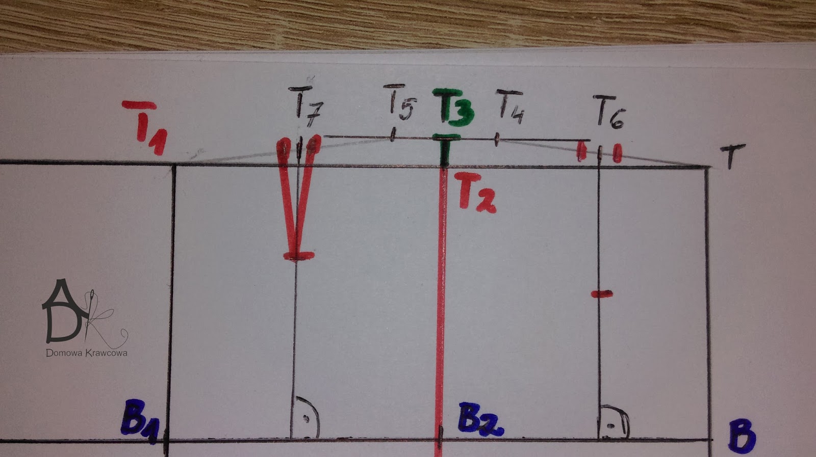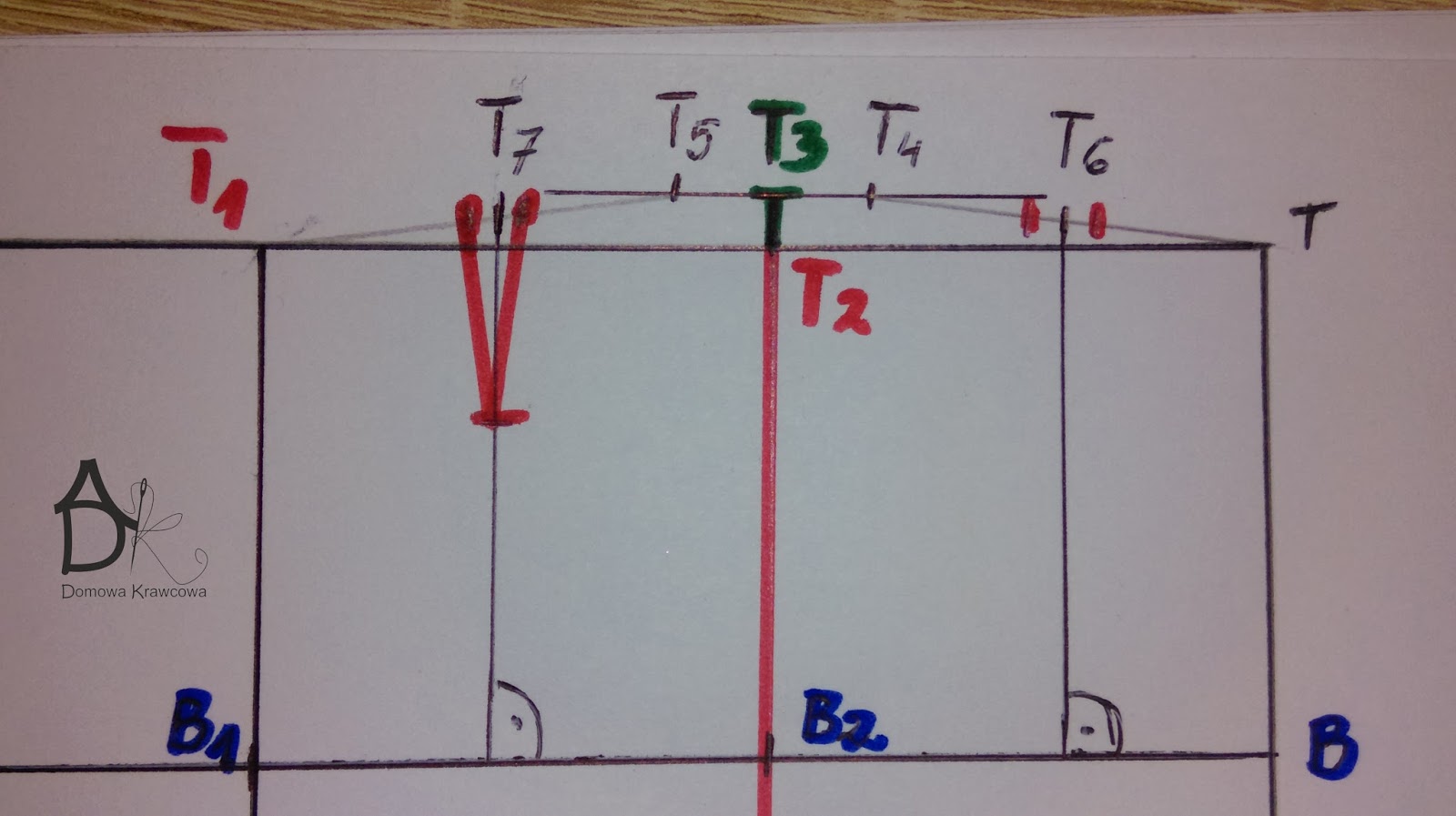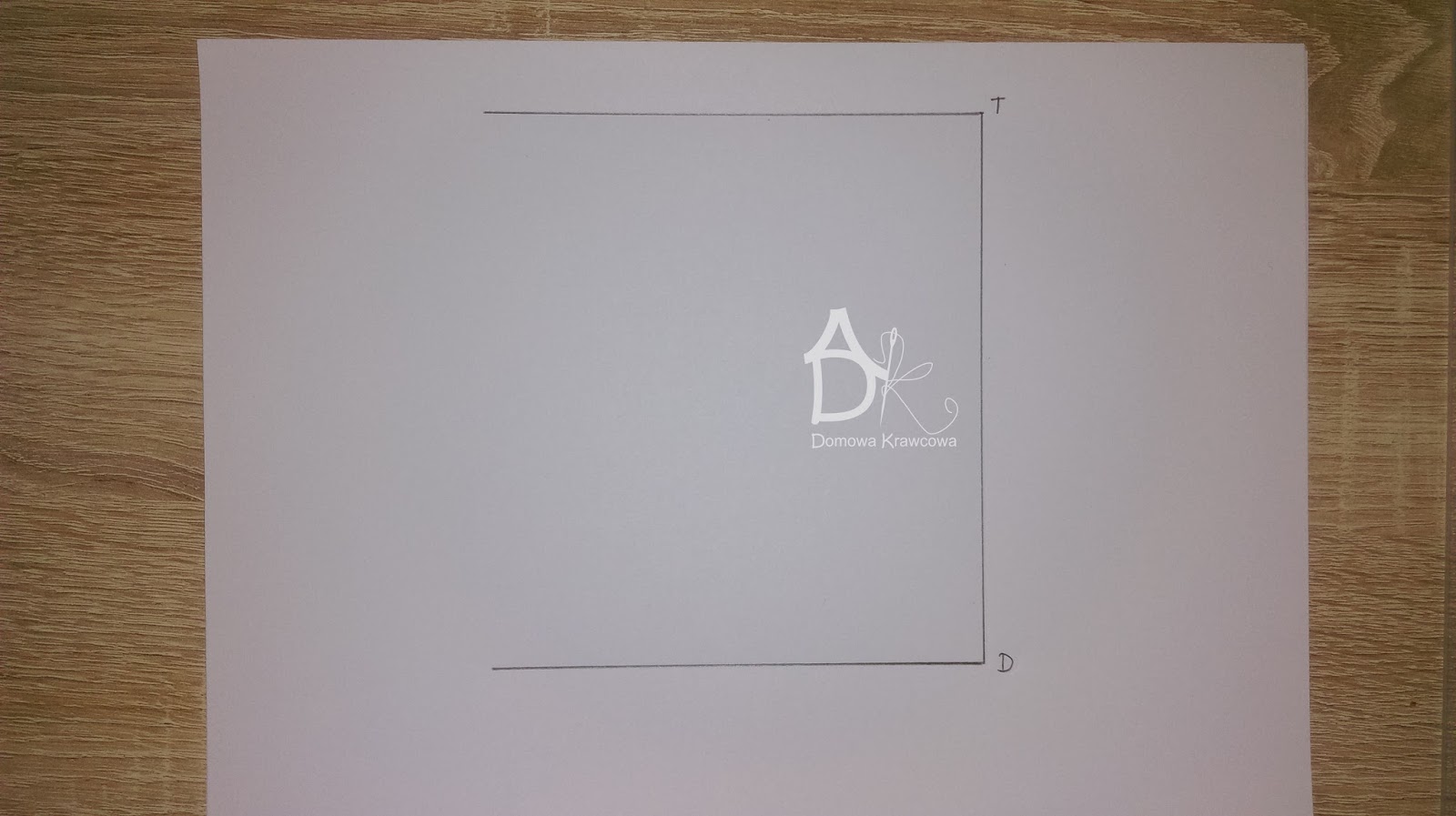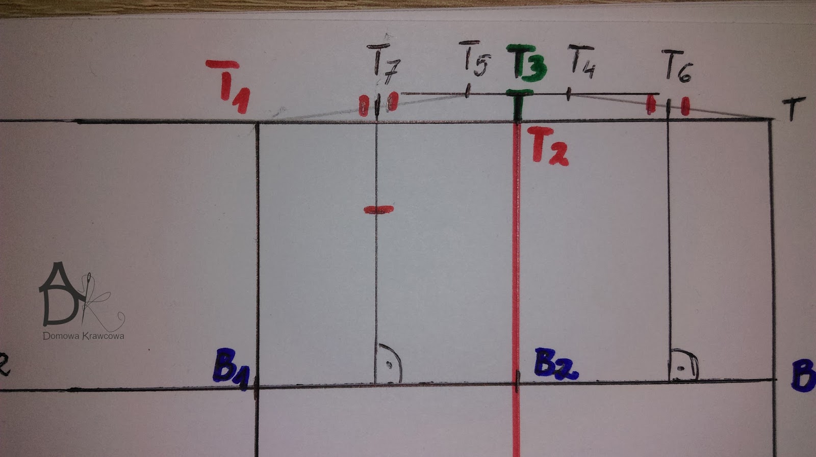 Od pkt T odmierzamy  pionowo w dół długość spódnicy do pkt D czyli TD = 52 cm. Następnie od pkt D wykreślamy prostą prostopadłą do TD jest to nasza linia dołu.