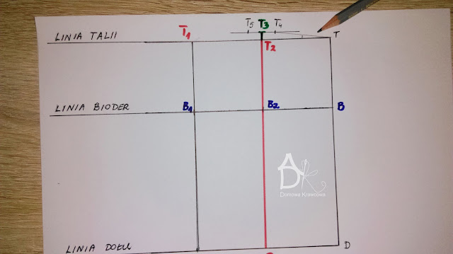 Teraz wyznaczymy linię zaszewki tyłu. Wykreślamy linię prostą łączącą pkt T4 z T.