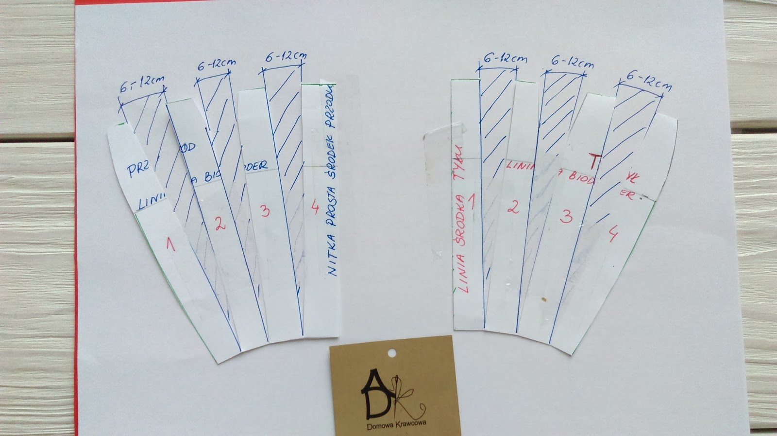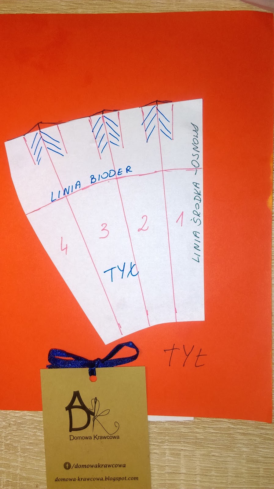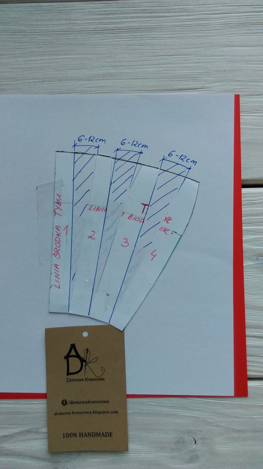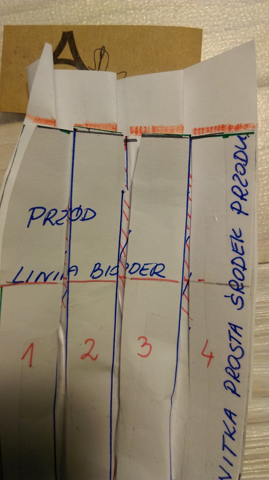 Teraz pobawimy się trochę w składanie papieru. Fałdy układamy tak jak na materiale wykreślamy ponownie łuk na linii talii czerwona kredka i nadmiar papieru obcinamy.