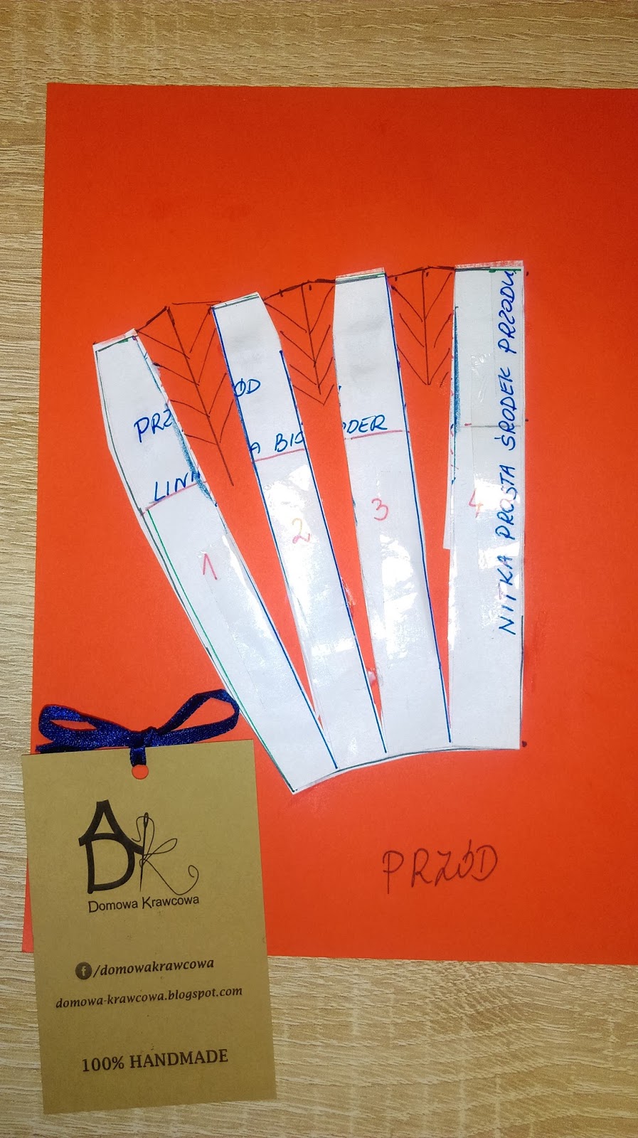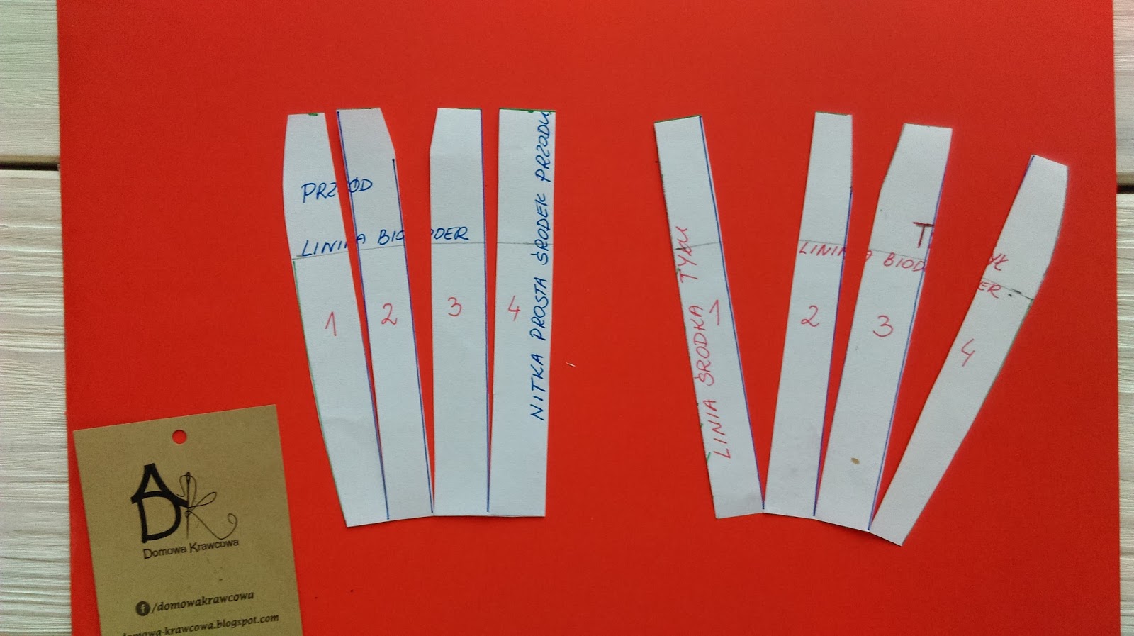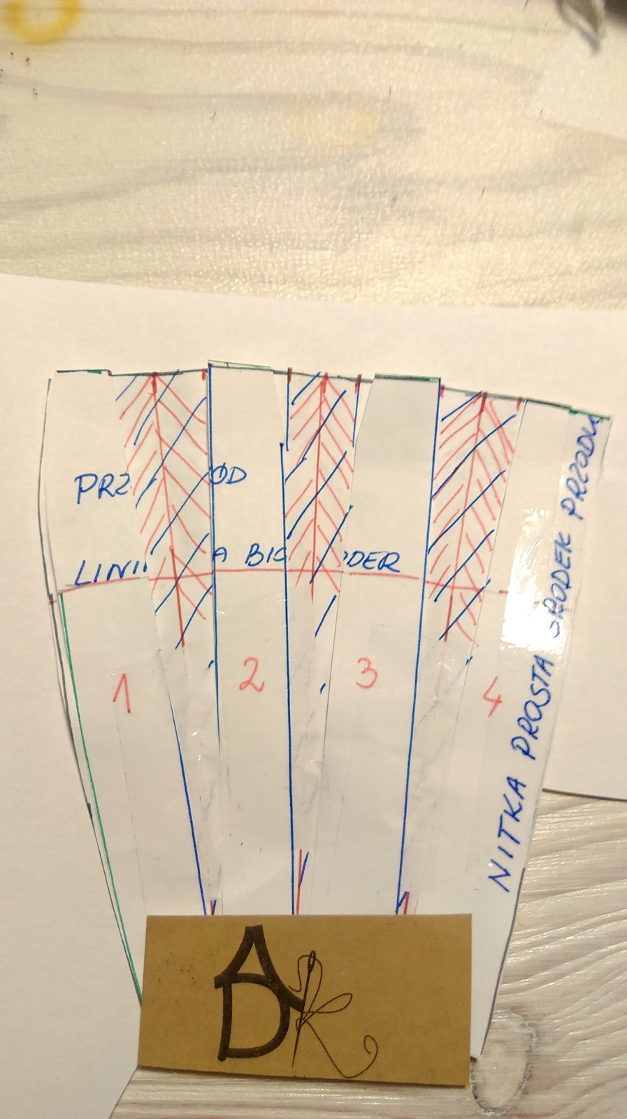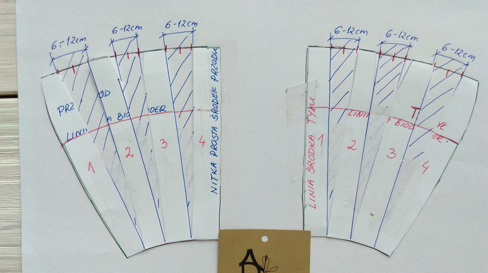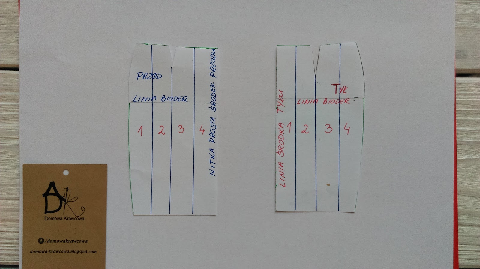 Teraz pobawimy się trochę w składanie papieru. Fałdy układamy tak jak na materiale wykreślamy ponownie łuk na linii talii czerwona kredka i nadmiar papieru obcinamy.