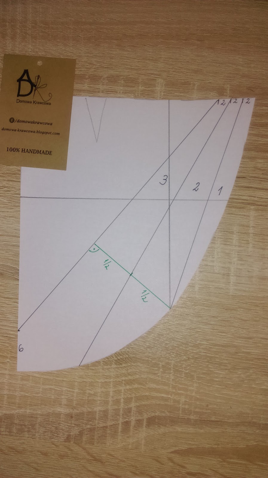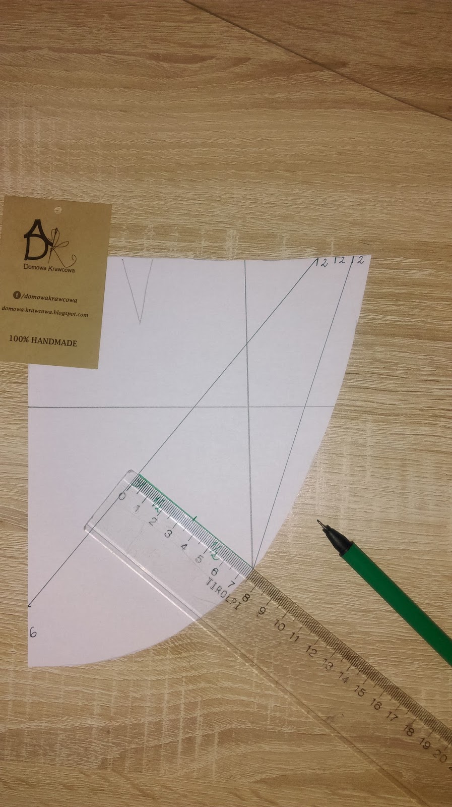 Na linii boku od dołu odmierzamy 6cm i wykreślamy prostą od ostatniej cyfry2. Następnie wykreślamy prostą od pierwszej (2) do linii środka spódnicy na łuku.
