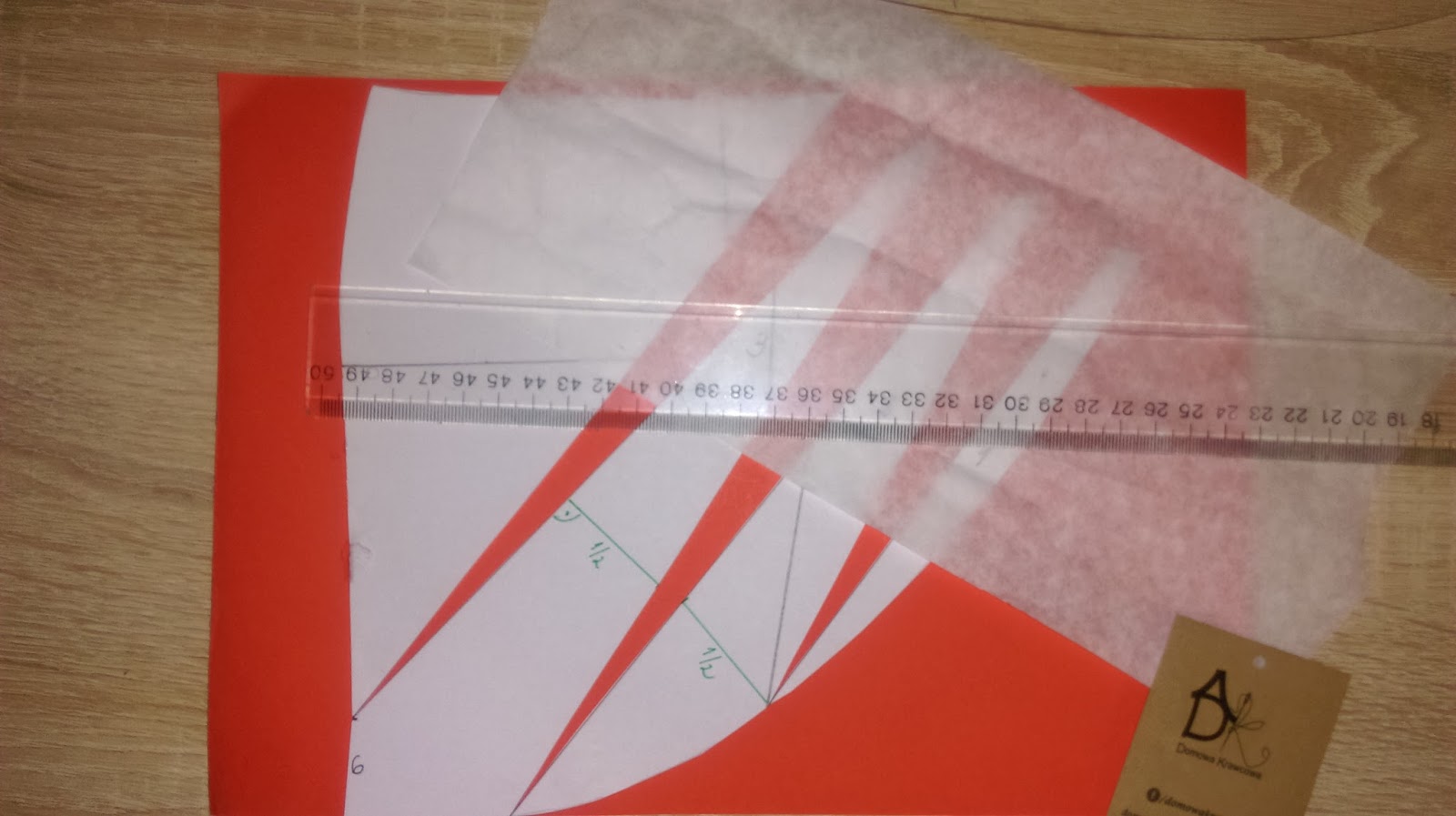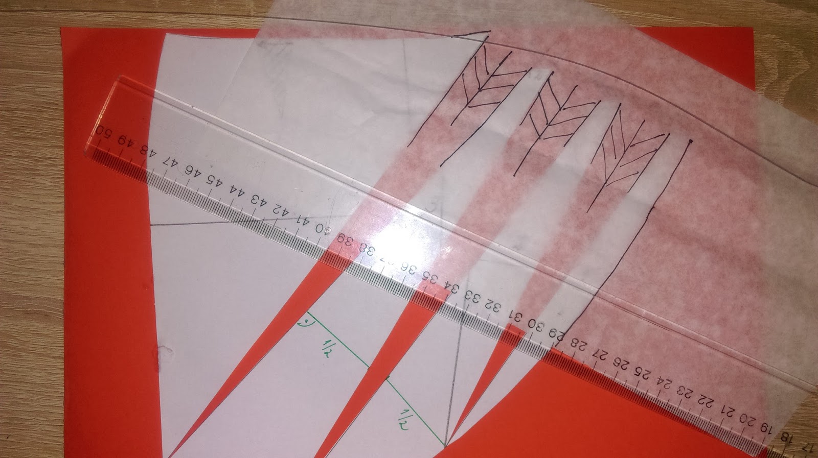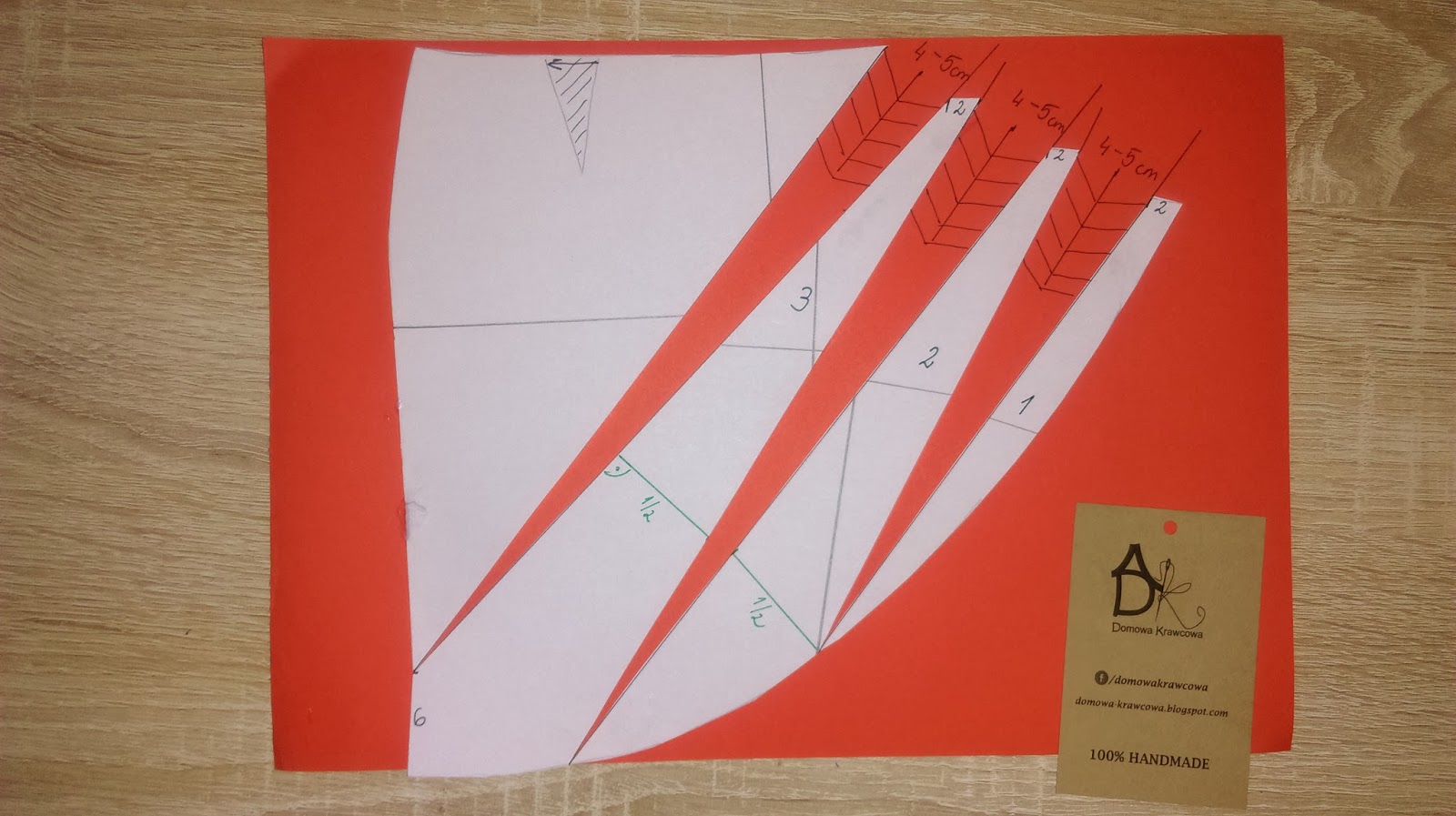 Teraz rozcinamy wzdłuż wcześniej wykreślonych linii. Nakładamy pociętą formę na papier (ja dla kontrastu na czerwony) i rozsuwamy 4-5cm w zależności jakie głębokie fałdy mają być.