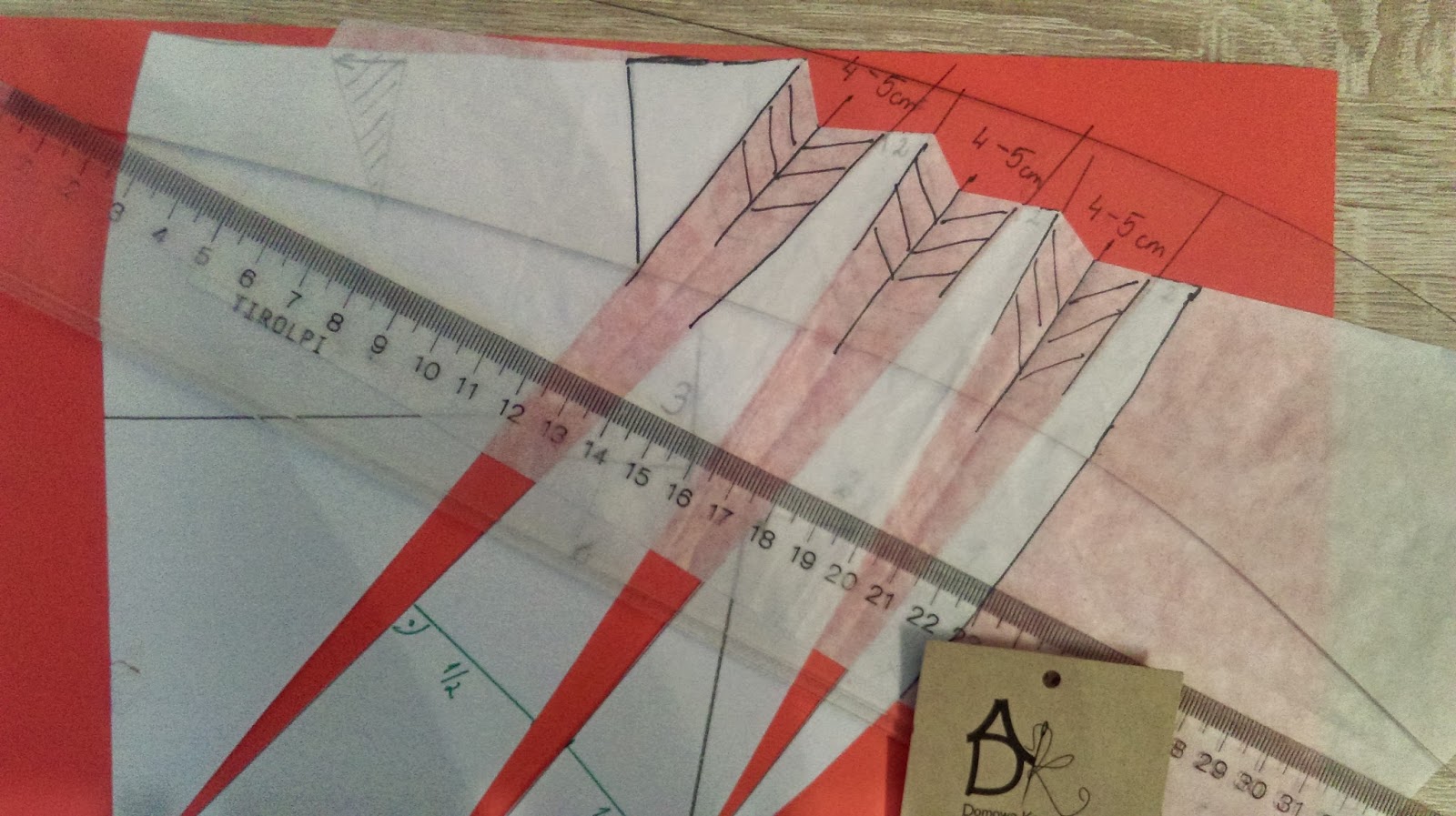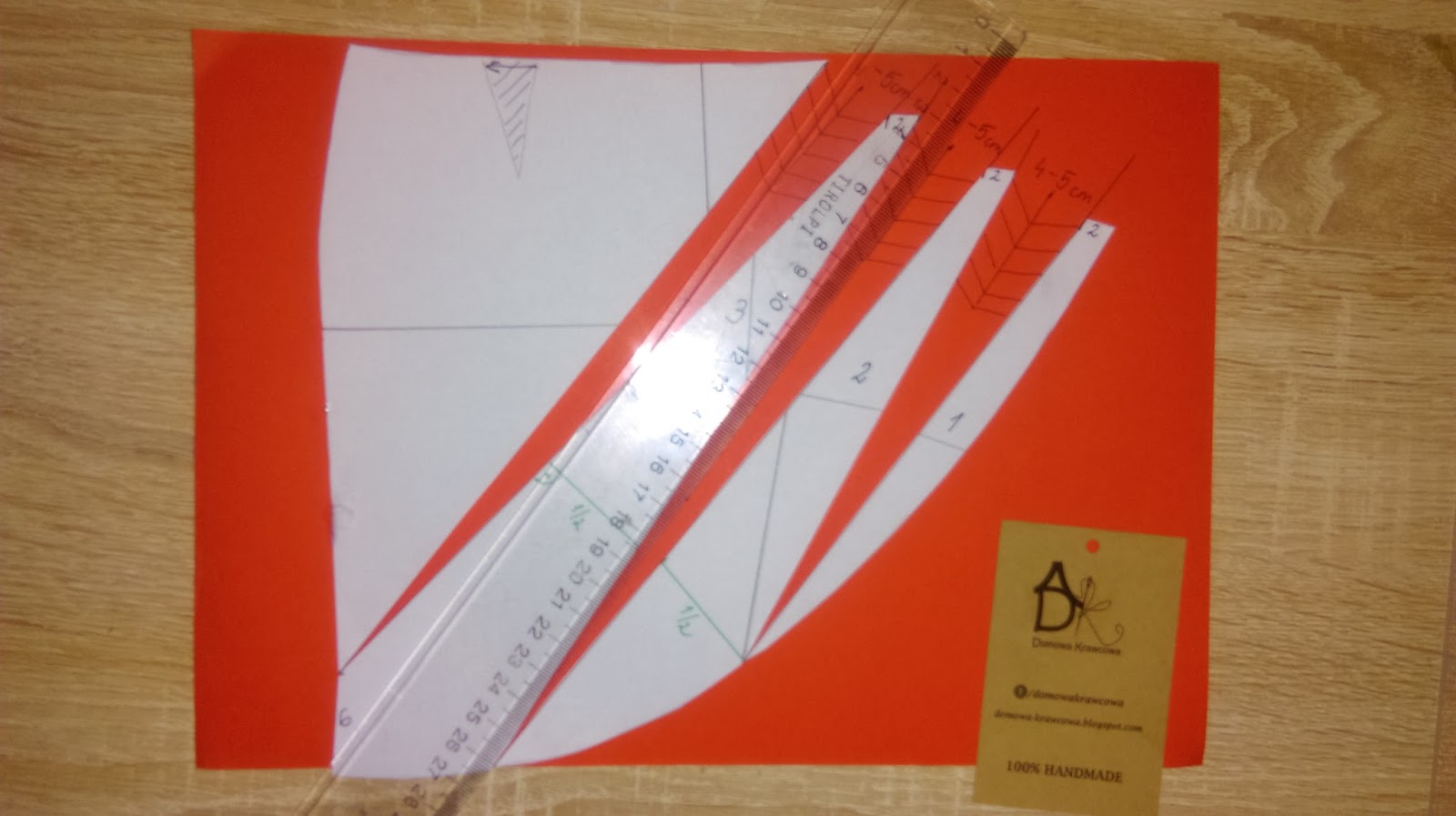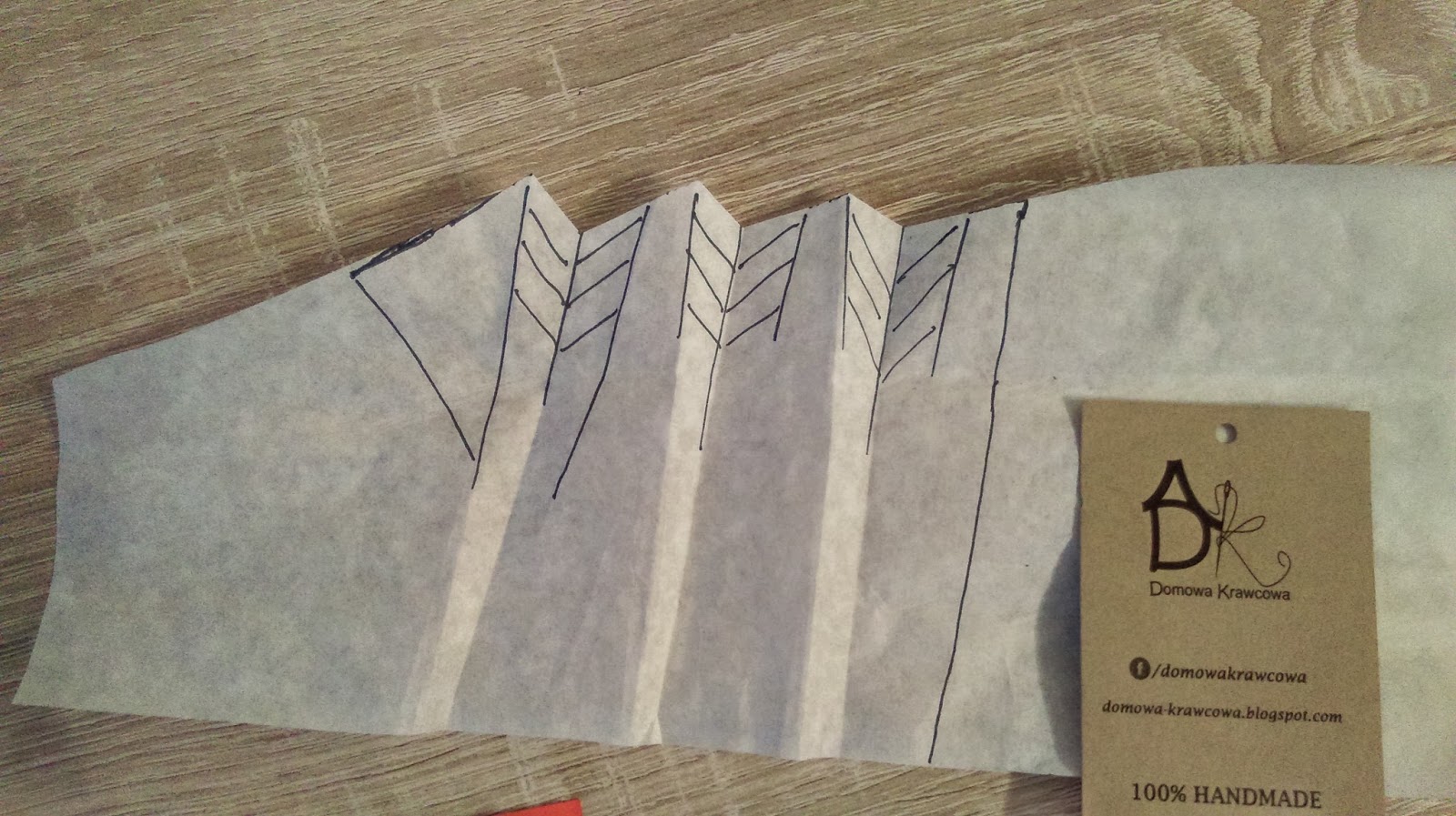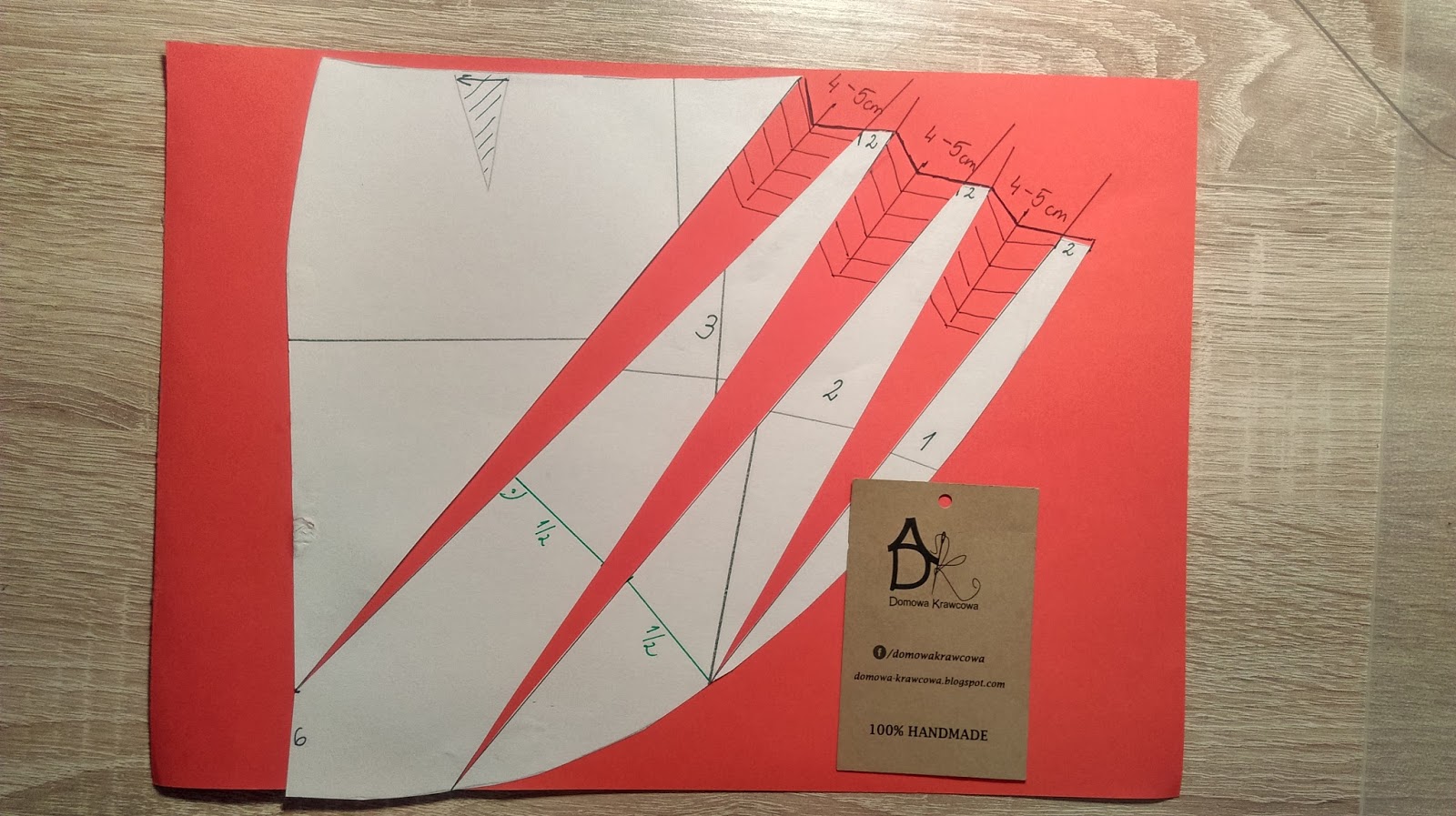 Teraz rozcinamy wzdłuż wcześniej wykreślonych linii. Nakładamy pociętą formę na papier (ja dla kontrastu na czerwony) i rozsuwamy 4-5cm w zależności jakie głębokie fałdy mają być.