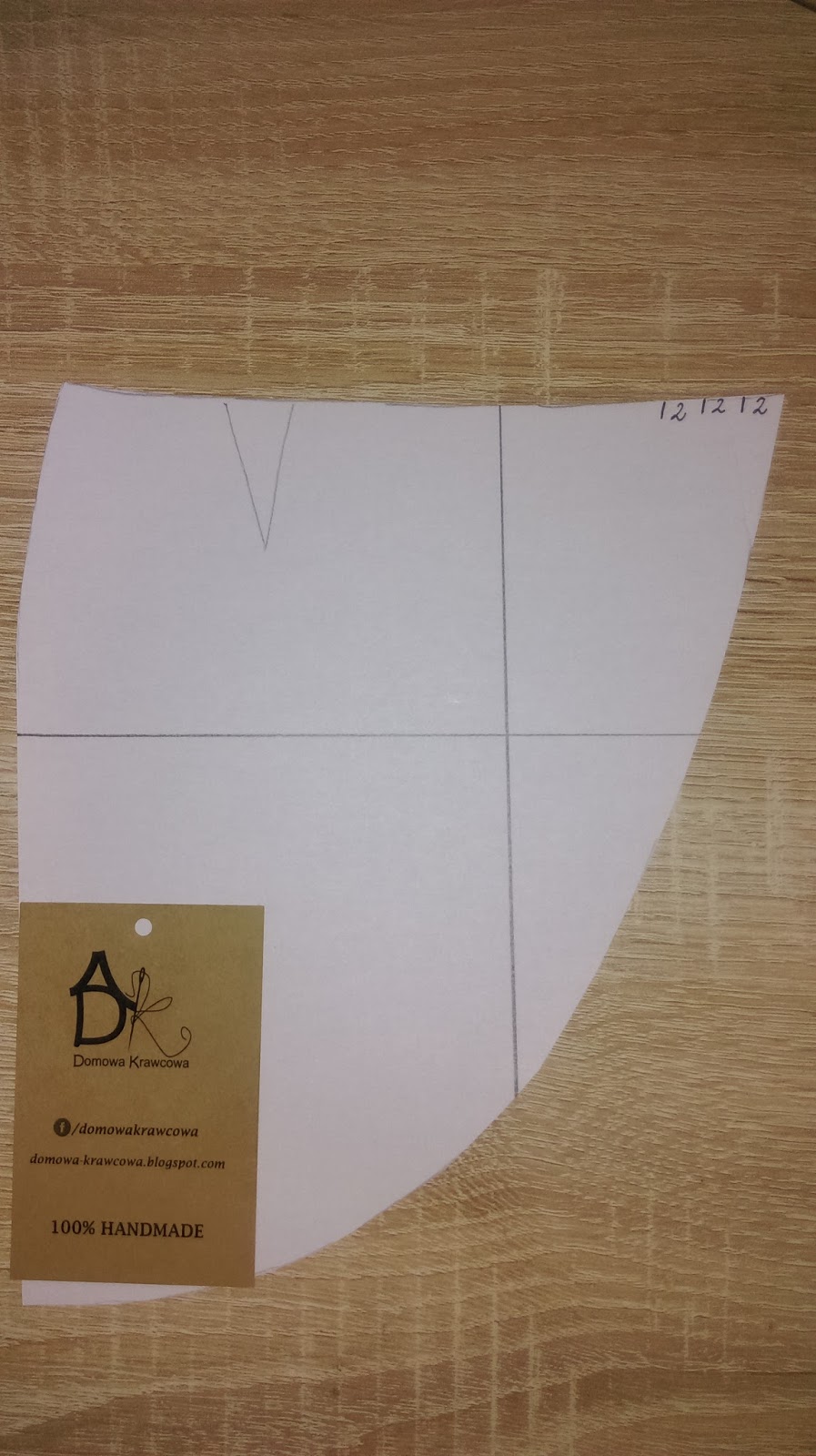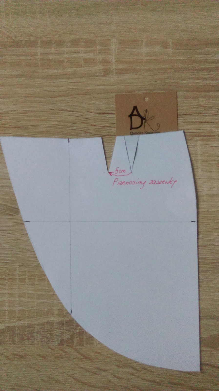 W ten sposób otrzymaliśmy  lewą spodnią formę spódnicy. Jeszcze musimy przenieść zaszewkę do środka spódnicy o 5cm, wykonujemy to by schować zaszewkę pod prawą częścią spódnicy.   Pamiętajcie, że należy przy krojeniu dodać na szwy 2cm i na podwinięcie 1,5cm.