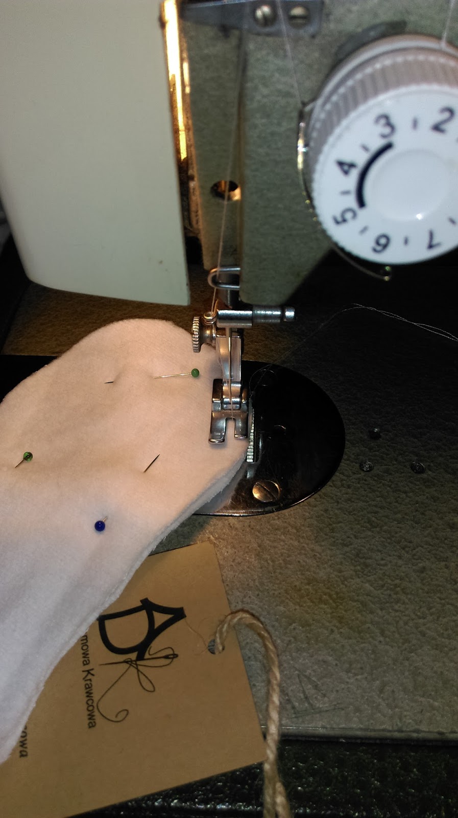 Teraz naszywamy białą wkładkę na podpaskę jednocześnie zaszywamy otwór.