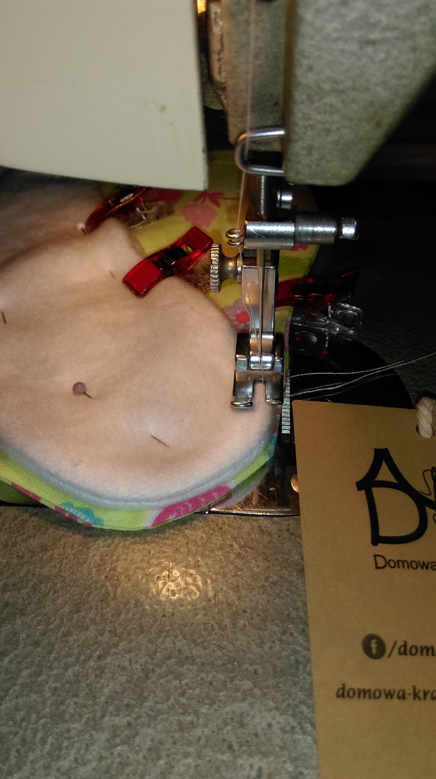 Odwracamy obie części podpasek na lewą stronę i obszywamy w koło zostawiając otwory na wywrócenie.