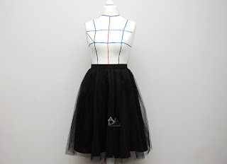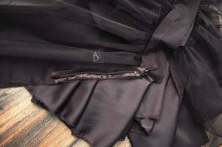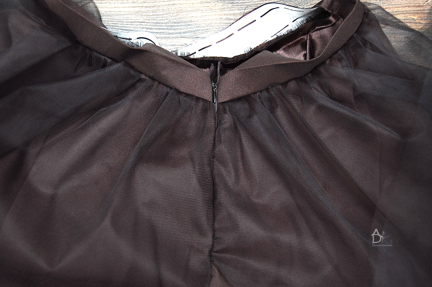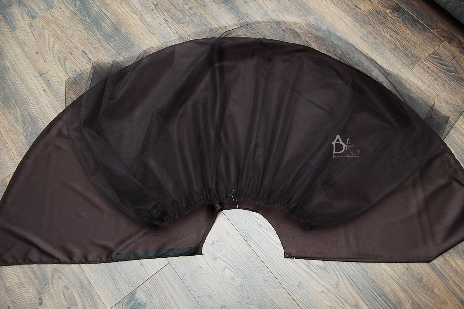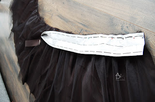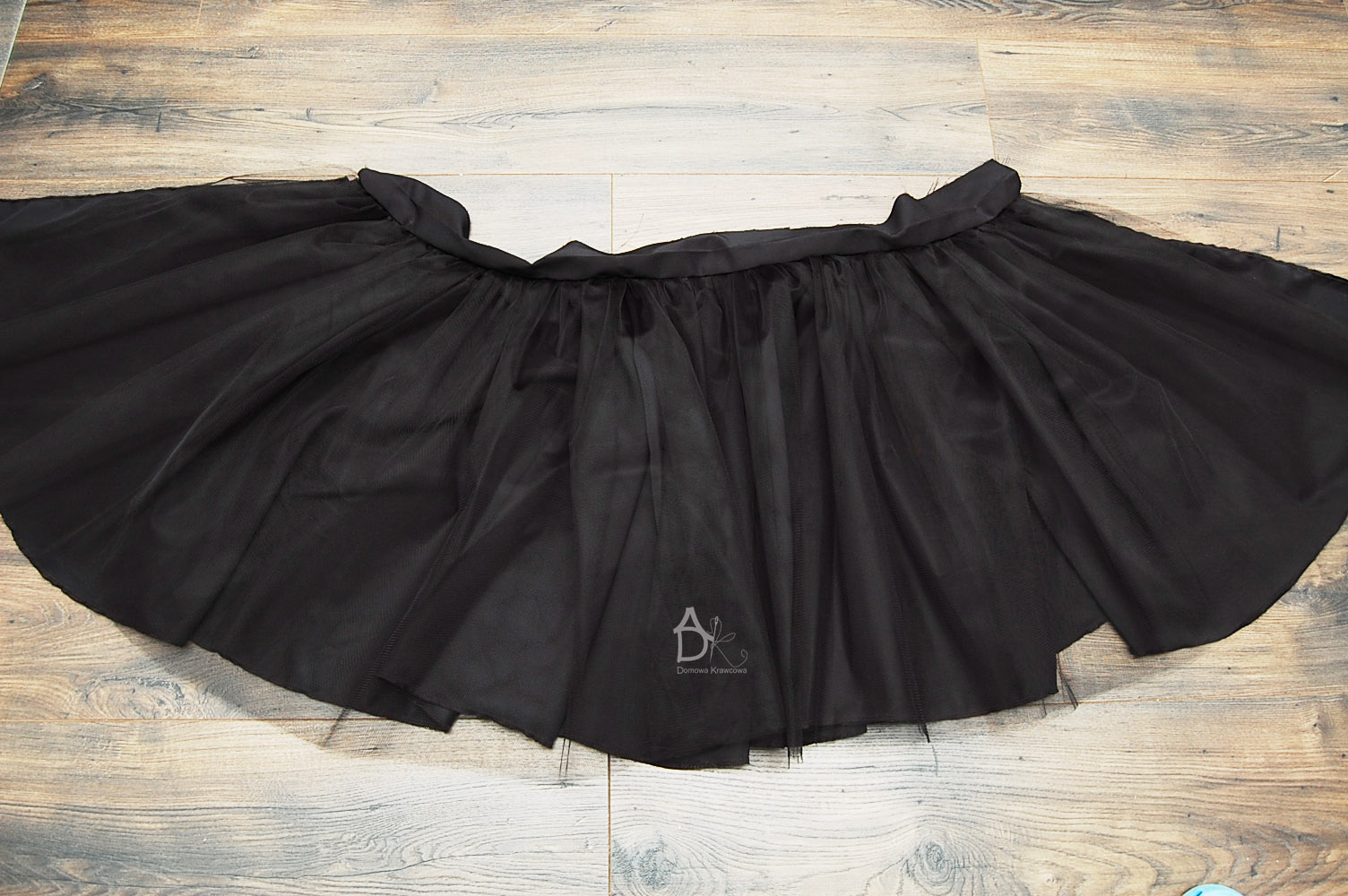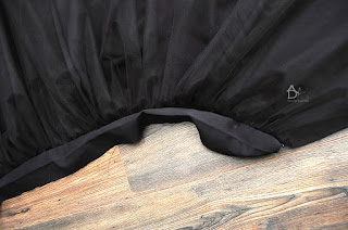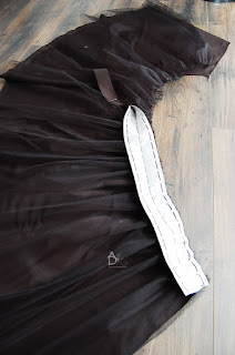 Kiedy przyszyjemy obie części możemy pospinać bok spódnicy i zeszyć nie zszywamy rozciętego tiulu on jest luźny.