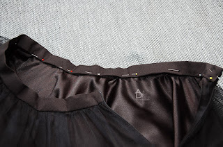 Spódnicę z satyny dzielimy na 4 części miejsca zaznaczamy szpilką, tiulową spódnicę umarszczoną też dzielimy na 4 i oznaczamy szpilkami, i ostatnie pasek dzielimy na 4 części i oznaczamy szpilkami.