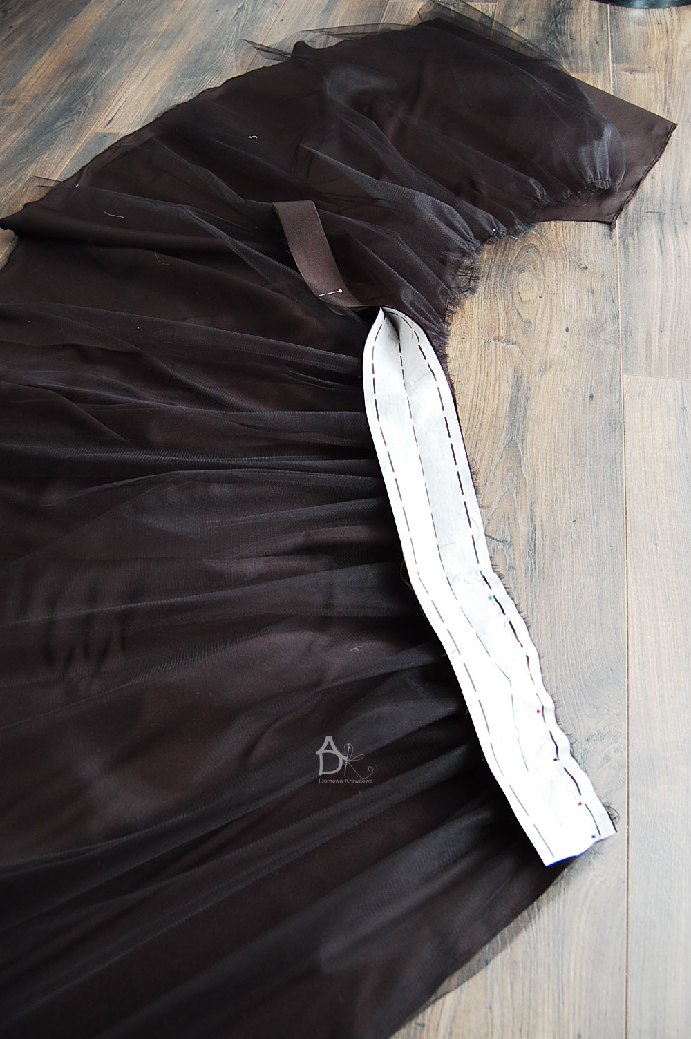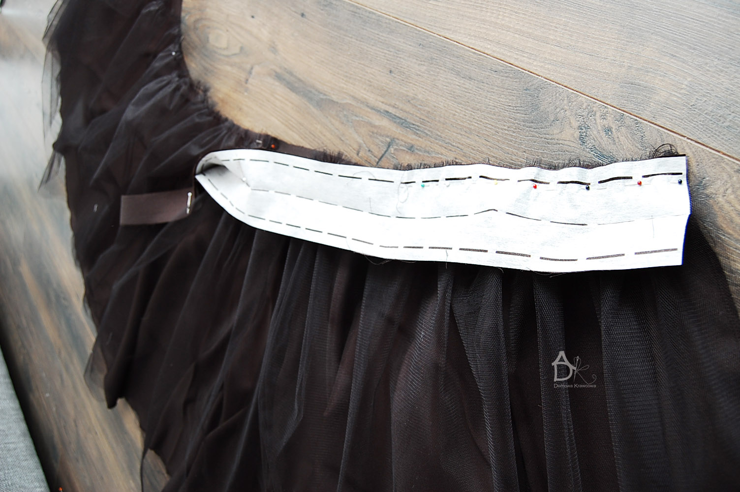 Między spiętymi szpilkami mamy nadmiar tkaniny tiulowej który musimy teraz ułożyć równo i pospinać gęsto szpilkami.