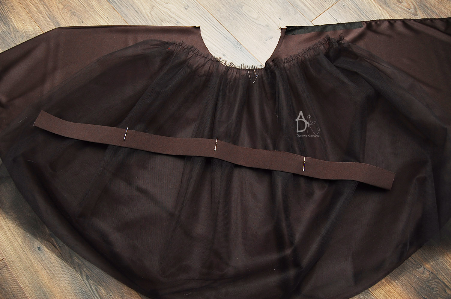 Jak już mamy wszystko oznaczone układamy naj lepiej na stole lub podłodze. Na dole spódnica z satyny lewą stroną do podłogi, na to nakładamy tiul środek ze środkiem boki z bokami na to kładziemy pasek i spinamy środek i boki ze spódnicami.