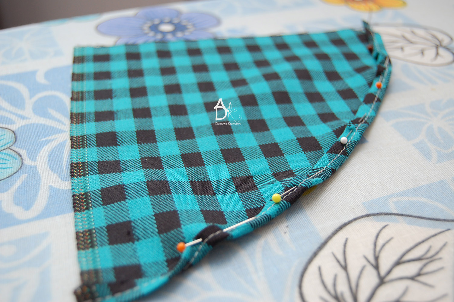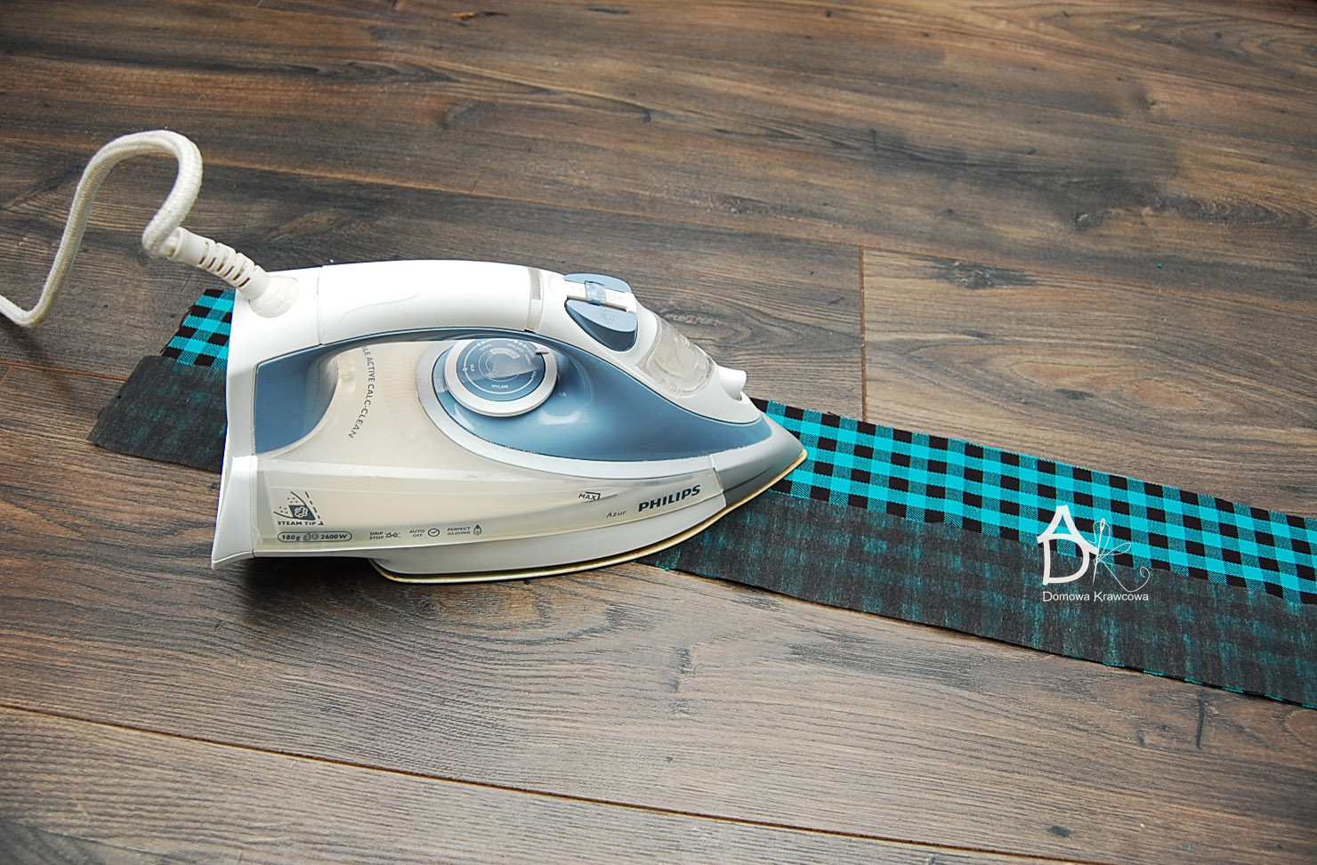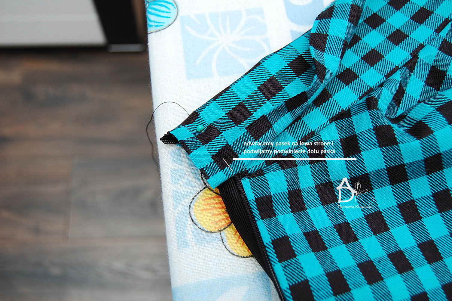 przeszywamy. Odwracamy na prawą stronę podwijamy pasek przypinamy szpilkami.