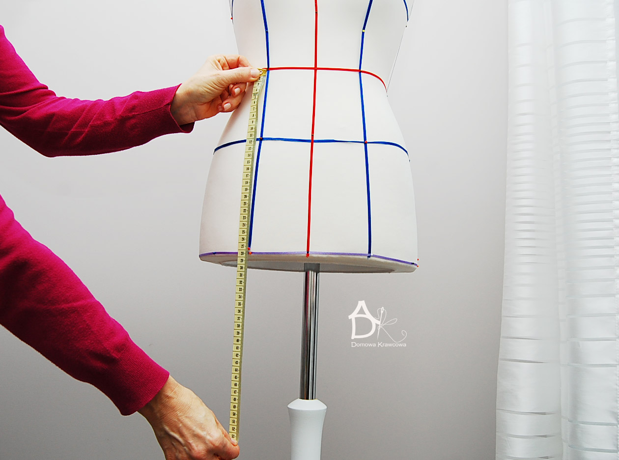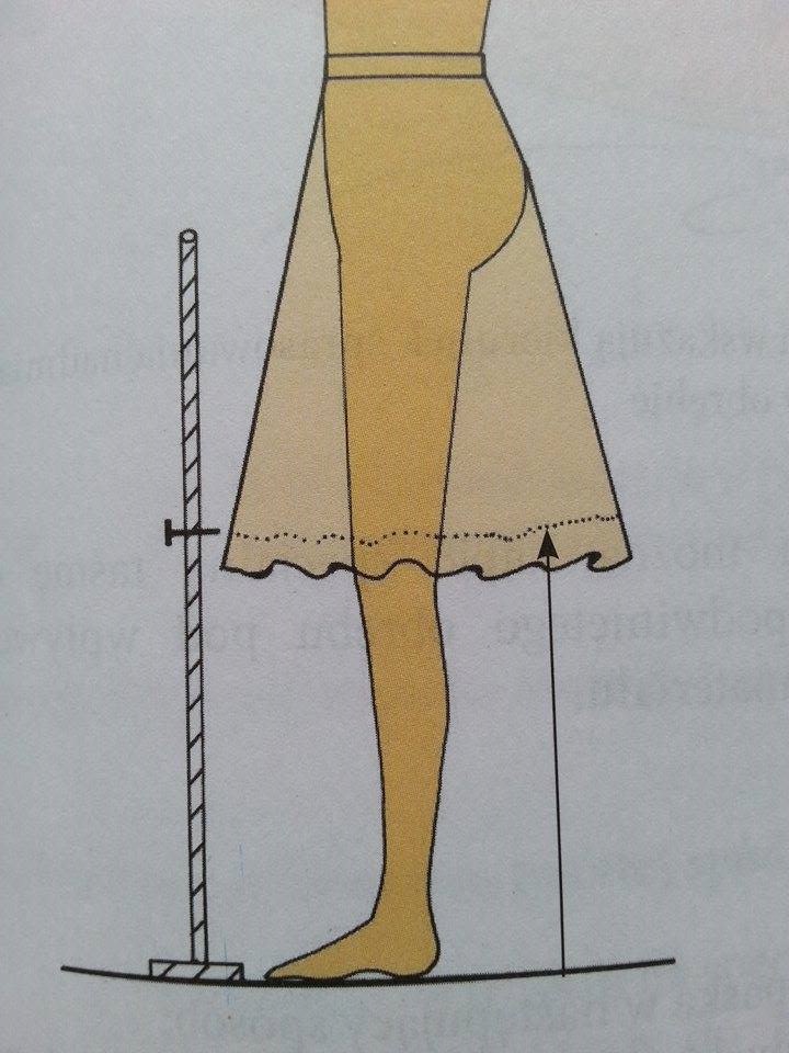 Spódnicę odwieszamy na wieszaku lub manekinie na 24 godziny lekko zwilżając tkaninę. Robimy to ponieważ tkanina pod wpływem ciężaru wydłuża się po skosach. W przypadku pełnego klosza występują 4 skosy. Musimy teraz zrobić cyrklowanie, które polega na wyrównaniu dołu przed podwinięciem. Możemy zrobić to tak jak na zdjęciu czyli od płaszczyzny podstawy odmierzamy równe odległości dookoła spódnicy odznaczając linię założenia obrębu kredą lub szpilkami.
