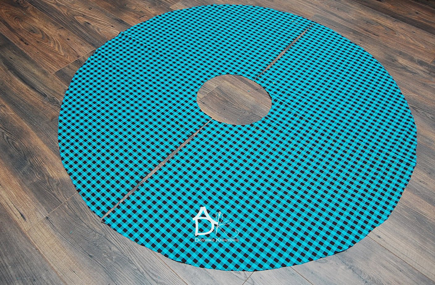 fastrygujemy całe koło. Może wystąpić nadmiar materiału czyli fałdki dlatego należy sprasować nadmiar materiały w jednym kierunku. Stebnujemy. Możemy również użyć do podwinięcia specjalnej taśmy do wykańczania dołów zdjęcie wkłady i obróbka klejowa. Jeszcze wykończyć można plisą skośną opis w krok po kroku.