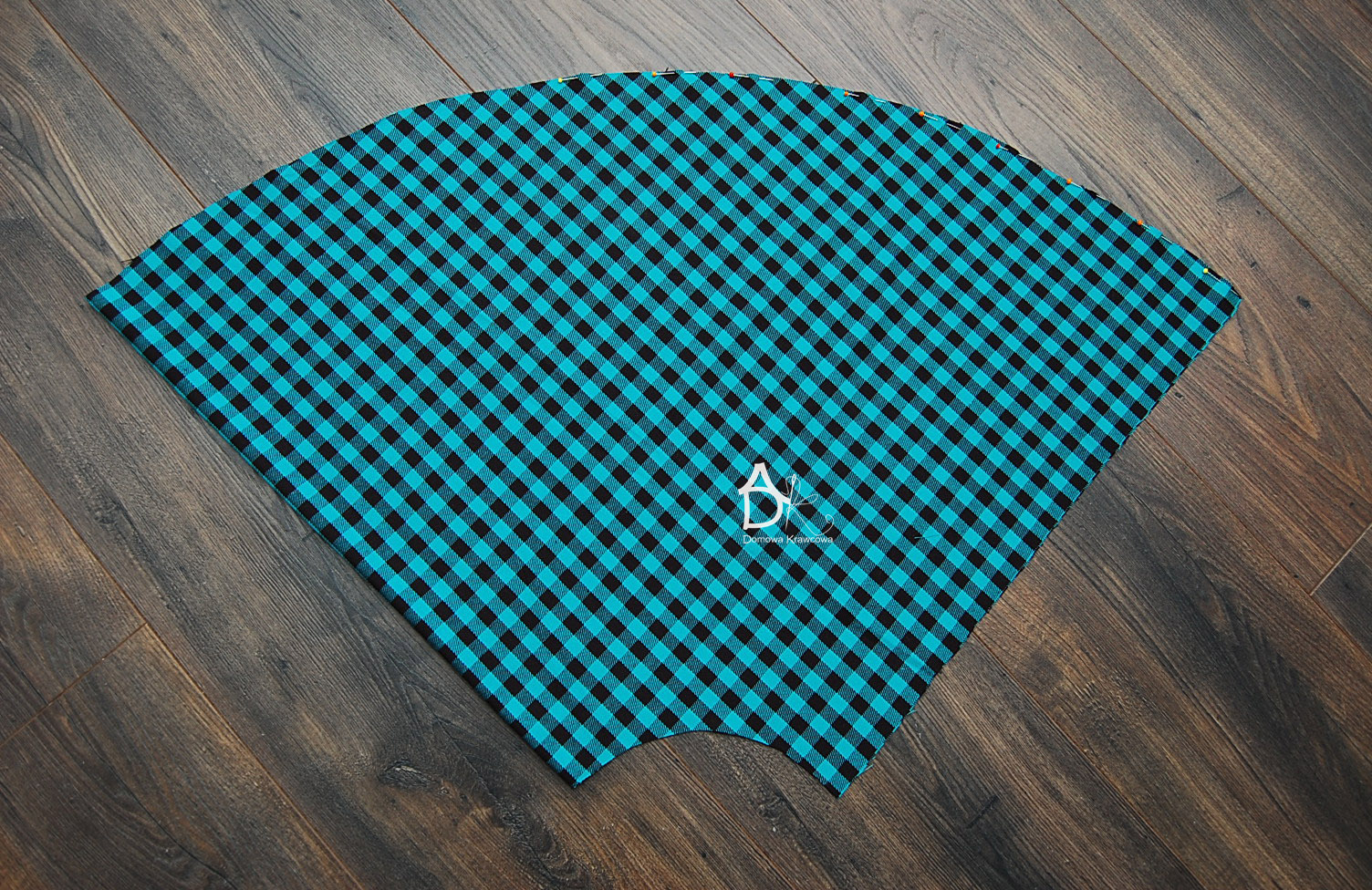 Wtedy jak wykroimy spódnicę będziemy mieć pełne koło i przetniemy wzdłuż jednego brzegu tkaninę. Szpilką zaznaczamy sobie gdzie mamy prawą stronę .