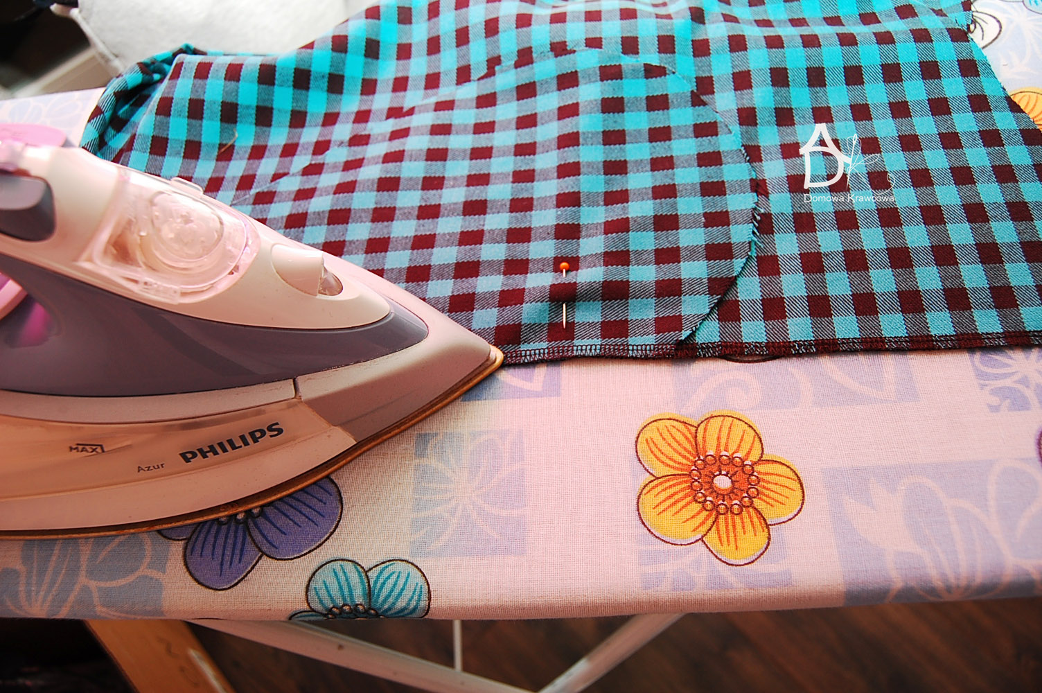obrzucamy overlockiem dół spódnicy, prasujemy brzeg podwinięty na 2cm  przypinając sobie szpilkami następnie