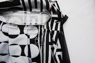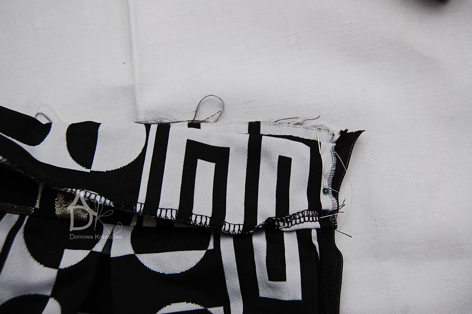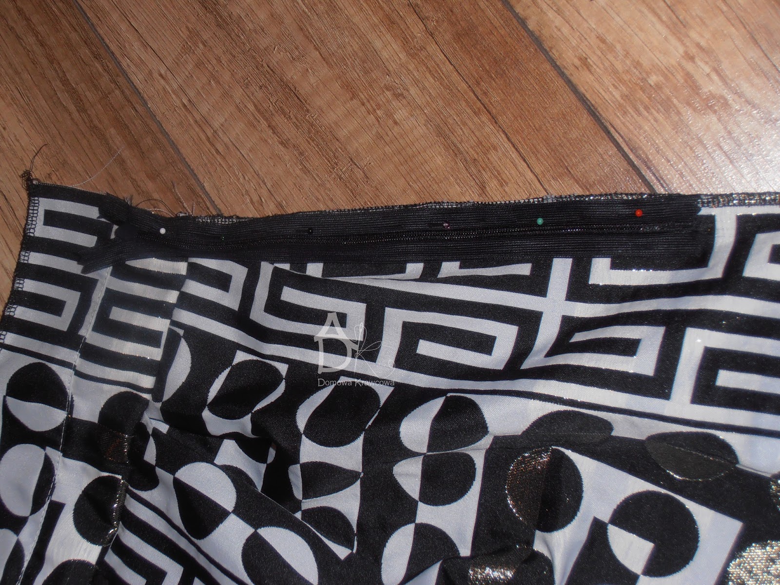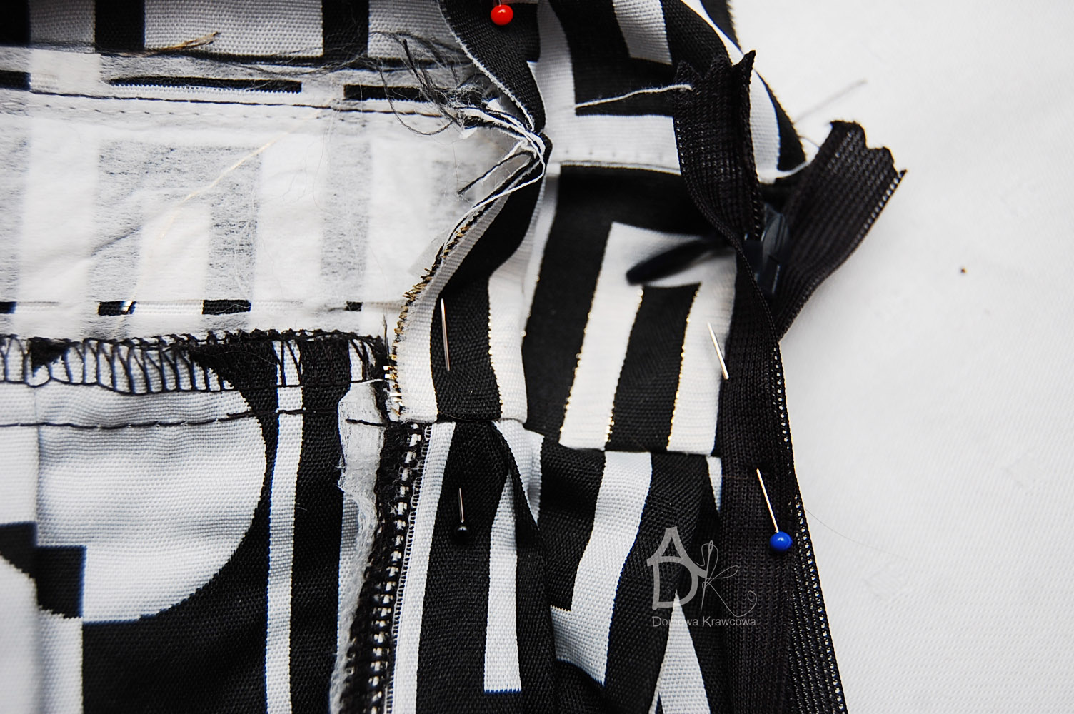 Wszywamy teraz zamek Ja wybrałam kryty czarny, zapinamy go i przypinamy prawą stroną do prawej strony tkaniny. Zwracamy uwagę by górna część zamka zaczynała się dokładnie w zagięciu paska. Podklejamy flizeliną miejsce wszycia zamka by usztywnić to miejsce i nie marszczyła się tkanina.