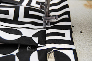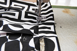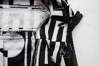 Składamy szew tylny upinamy szpilkami i zeszywamy. Ja zakładam stopkę do wszywania zamka by lepiej dojść do miejsca koło zamka.