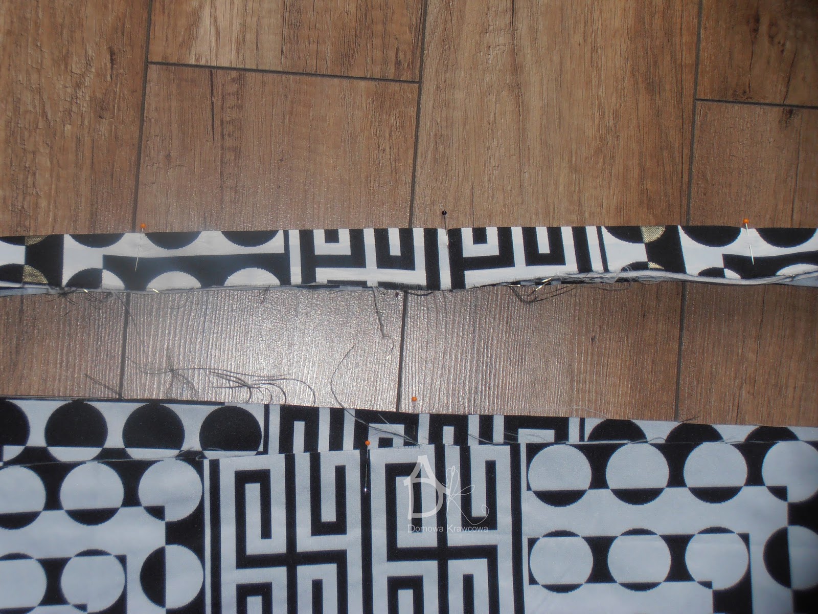 Ponieważ Ja miałam za mało tkaniny pasek mam uszyty z dwóch części zszyty po szerokości 9cm. Czyli każda część miała szerokość 5,5cm. Wcześniej każdą część okleiłam klejonką, następnie zeszyłam i przestebnowałam  po stronie wewnętrznej by lepiej się układał pasek. (zdjęcie jest z późniejszego etapu bo zapomniałam zrobić tą operację).