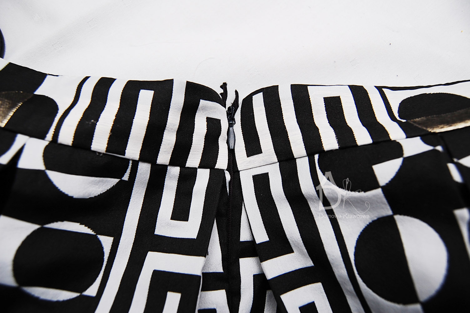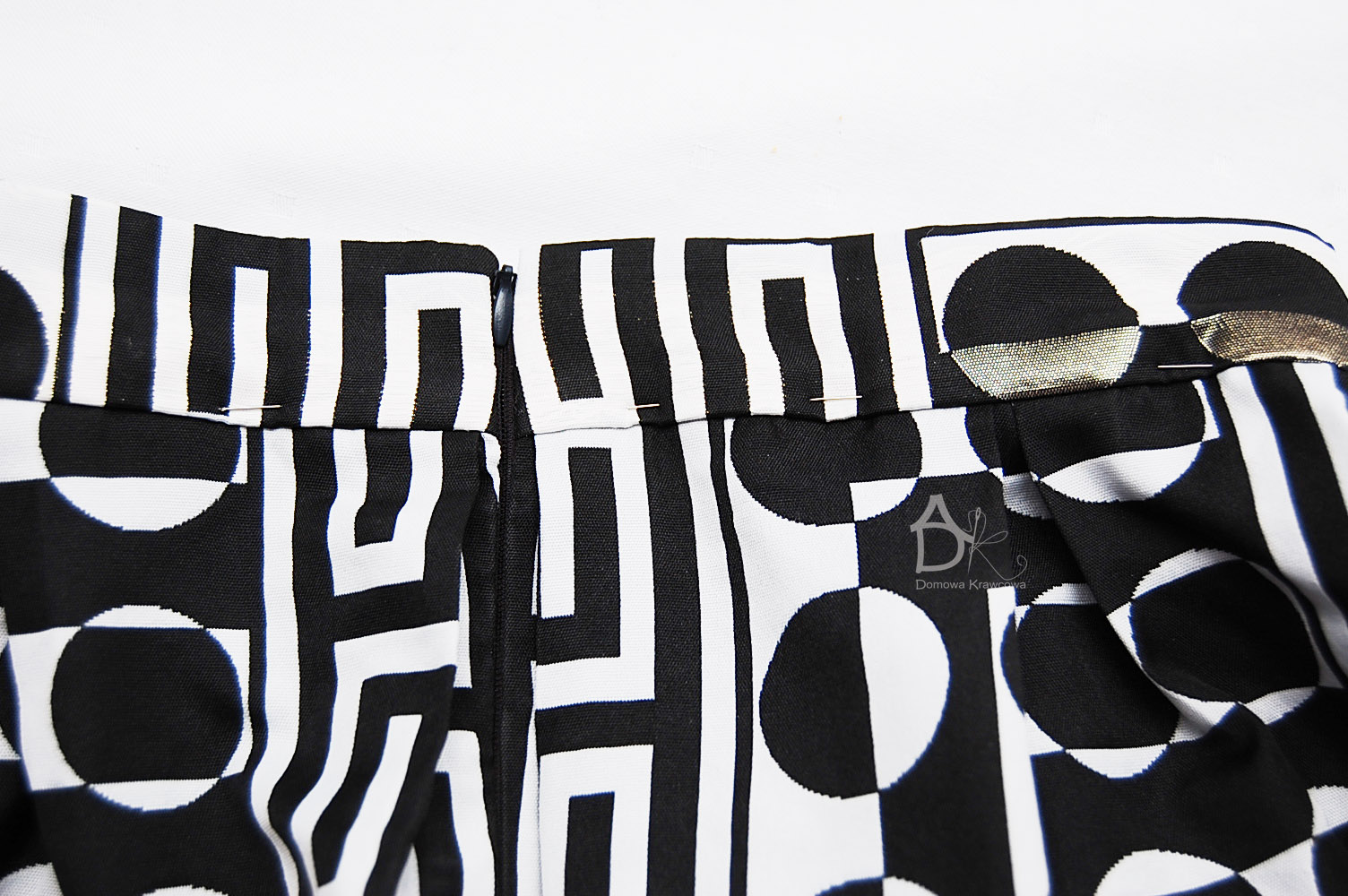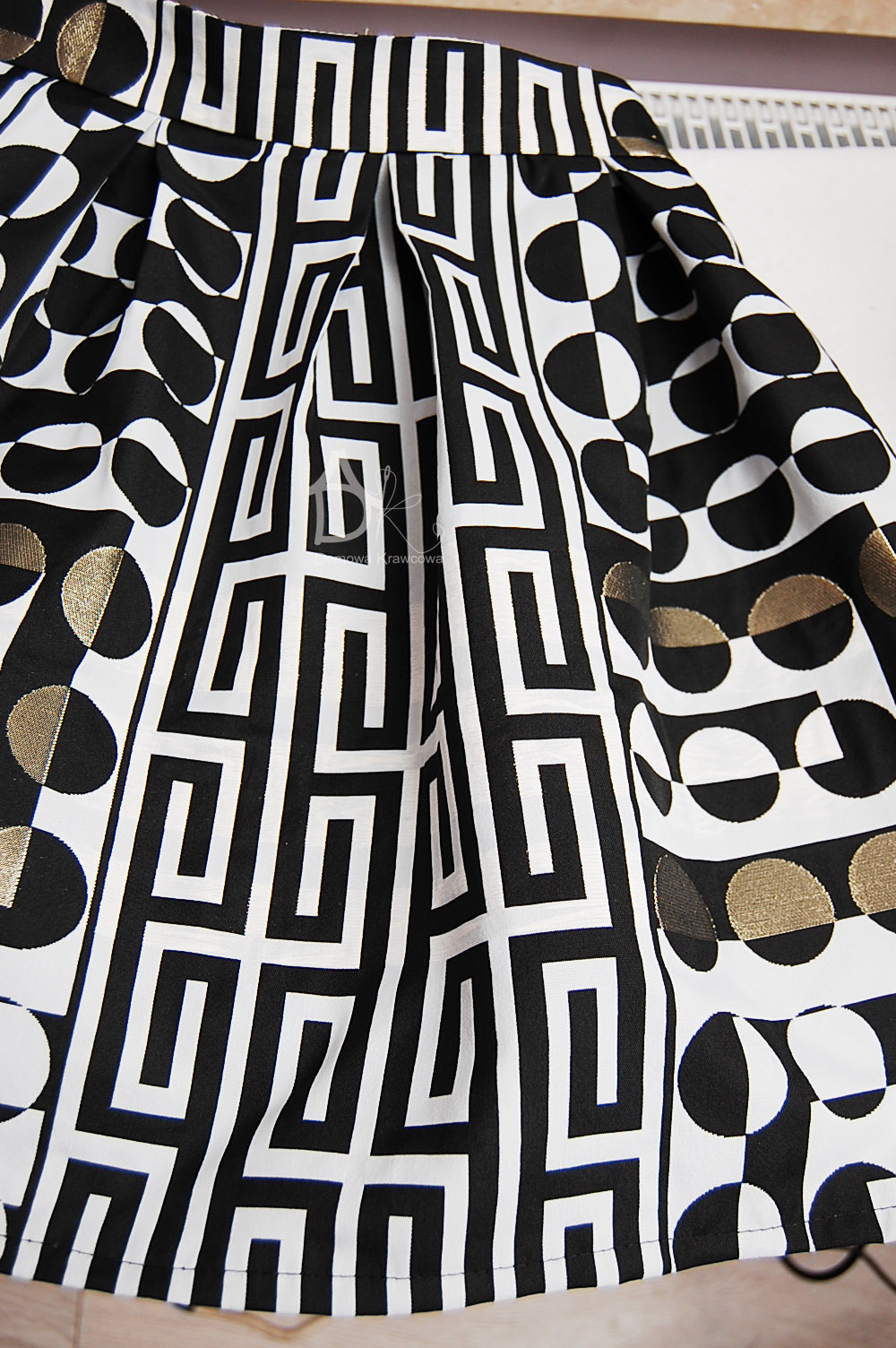 Wspaniała spódnica z kontrafałdami w geometryczne wzory, uszycie jej jest bardzo proste i przyjemne. Jest ona w kolorze w czarno-białym z dodatkiem złota. Można ją nosić z eleganckimi trampkami i szpilkami.