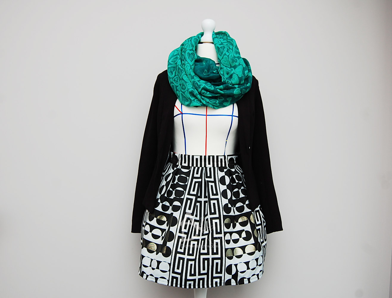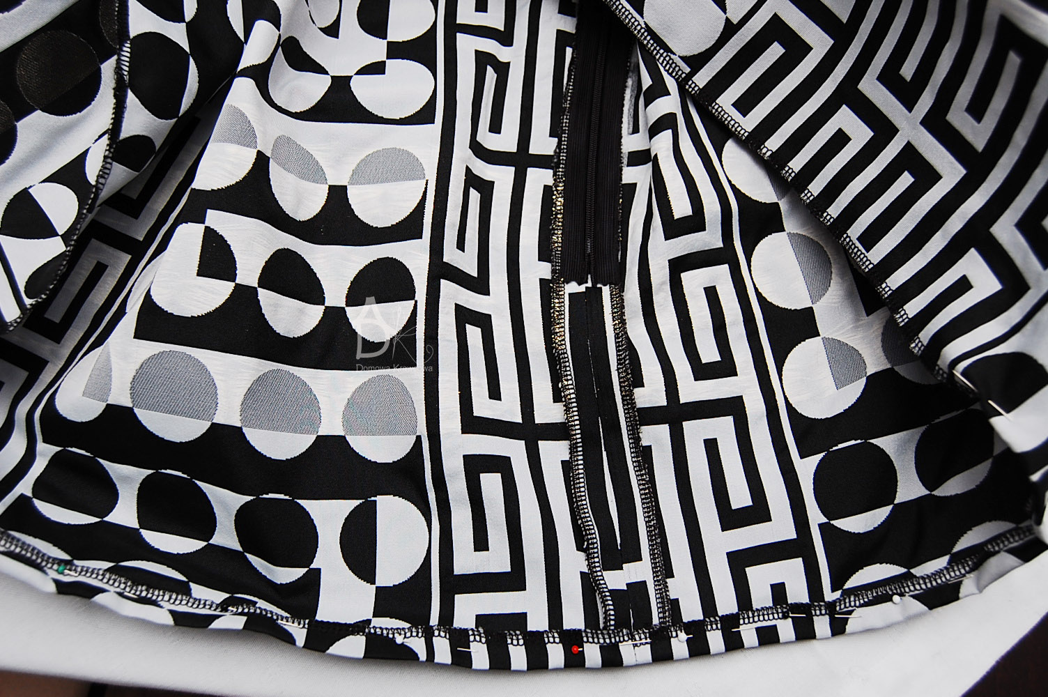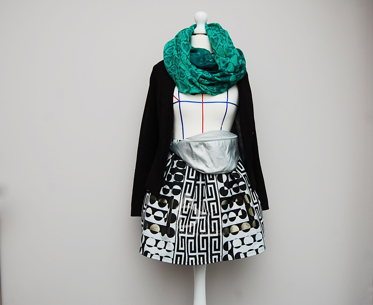 Wspaniała spódnica z kontrafałdami w geometryczne wzory, uszycie jej jest bardzo proste i przyjemne. Jest ona w kolorze w czarno-białym z dodatkiem złota. Można ją nosić z eleganckimi trampkami i szpilkami.