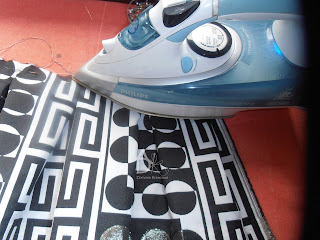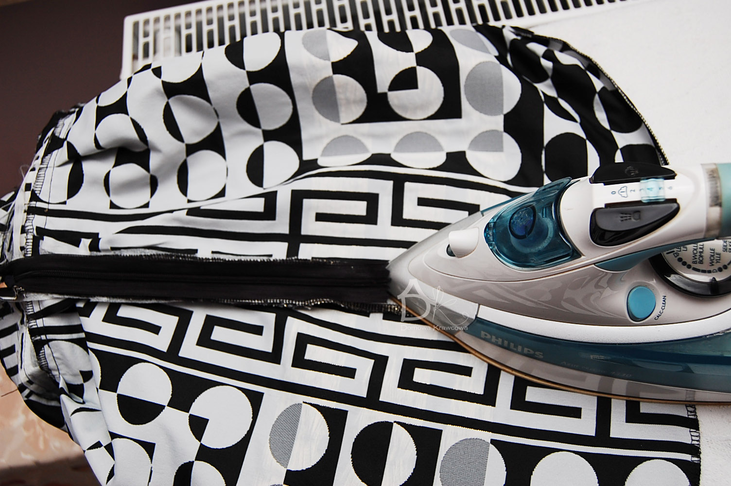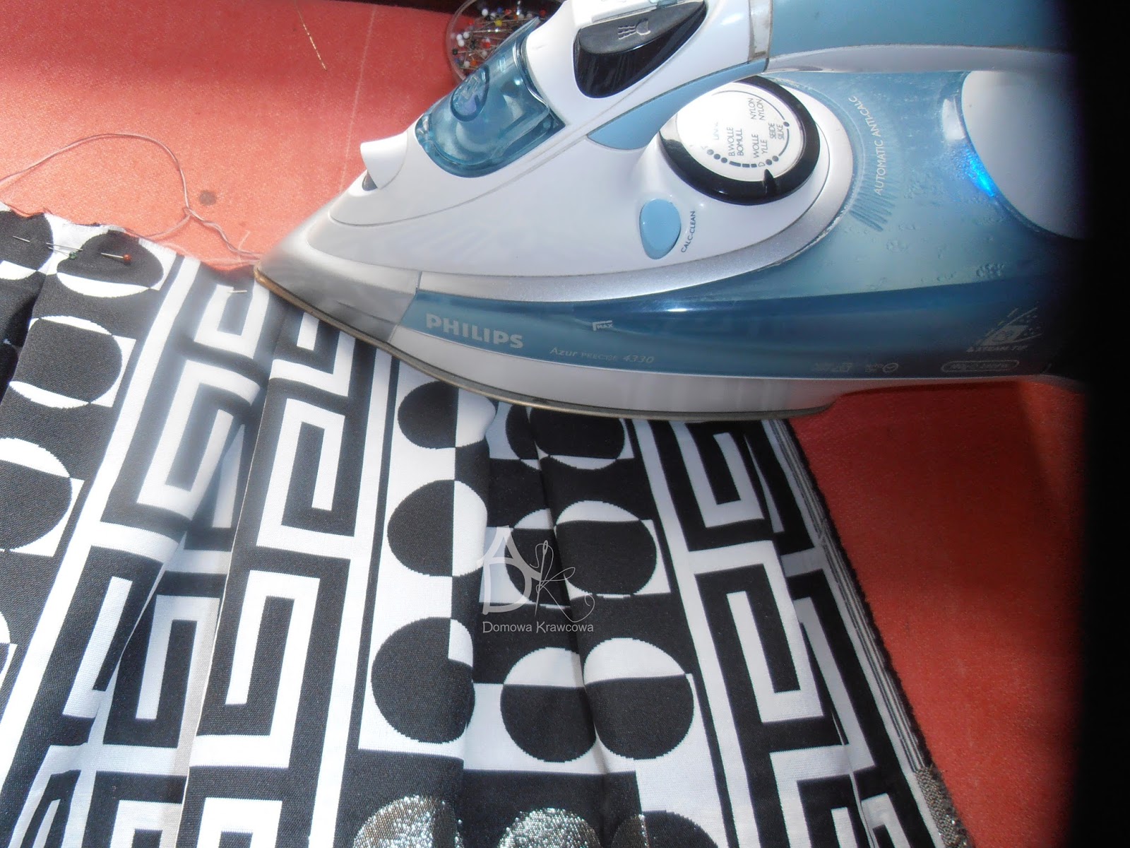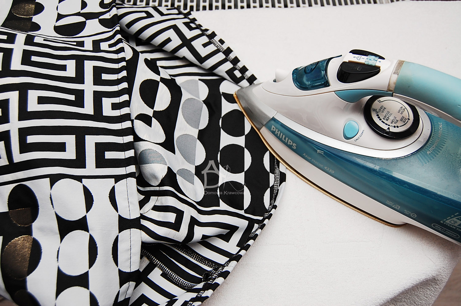Po zeszyciu tyłu rozprasowuje szew. Żelazko w przypadku żakardu temperatura 160 stopni przez ściereczkę.