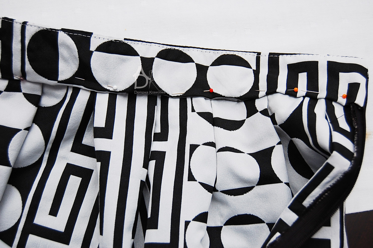 Przyszywamy na maszynie pasek do spódnicy zwracamy uwagę na ułożenie kontrafałd by nam się nie pozaginały.