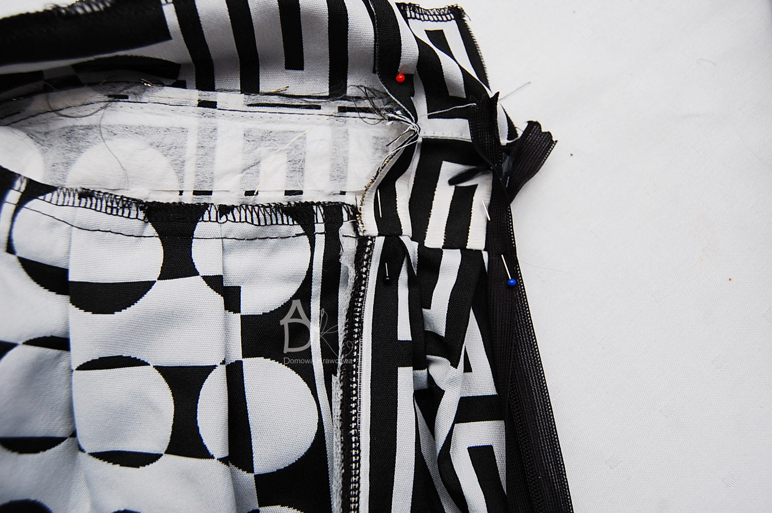 Następnie zapinamy zamek dopinamy do drugiej części boku i przypinamy szpilkami. Zwracam uwagę by zamek po zapięciu ładnie był w jednej linii wszycia paska.