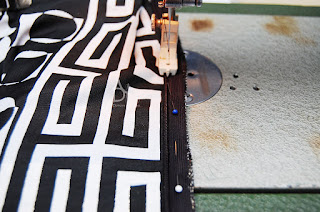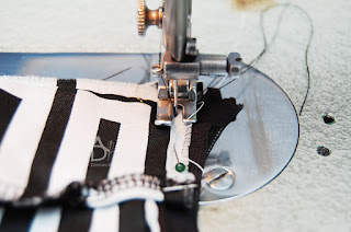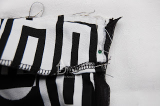 Odwracamy spódnicę na lewą praw stronę i zakładamy stopkę i przestebnujemy pasek dokładnie w miejscu przyszycia paska ze spódnicą . Szyjemy pomału i dokładnie by nie najechać na pasek.